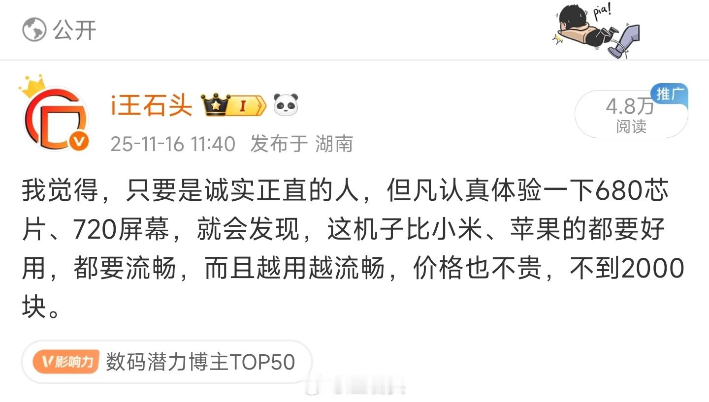 我用我的诚实正直担保,我觉得680芯片、720屏幕是个好东西,不仅越用越流畅,价格还很便宜。关键是平台还告诉我,这是优质内容,可以给我激励,说明得到了平台背书,平台也认可这个东西。现在我对680芯片、720屏幕有了更清晰的认知,我坚信这绝对是个好东西,所以再重申一下,希望平台再激励一下我。