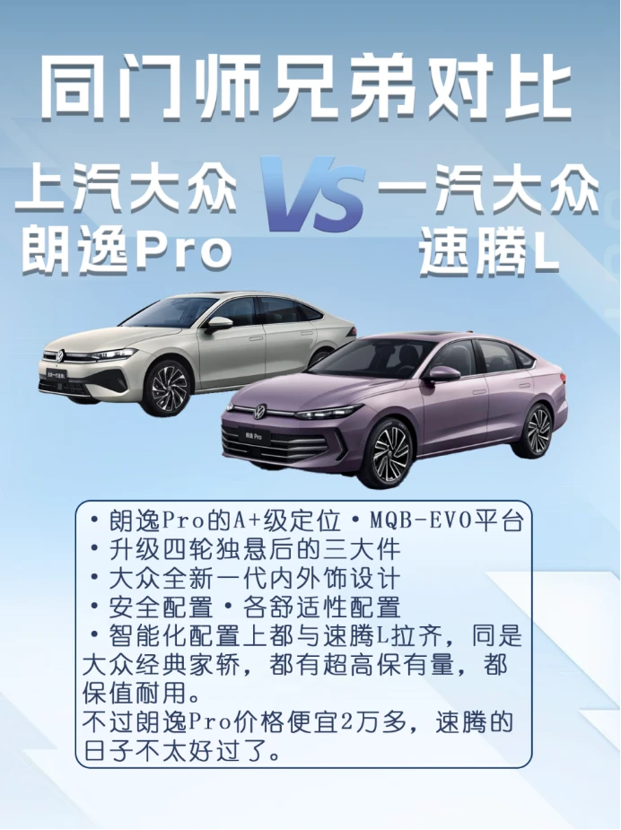 与速腾L相比,朗逸Pro在MQB-EVO平台、智能架构与设计语言上更具优势,底盘与空间体验相当,价格却低2万元以上,性价比突出。