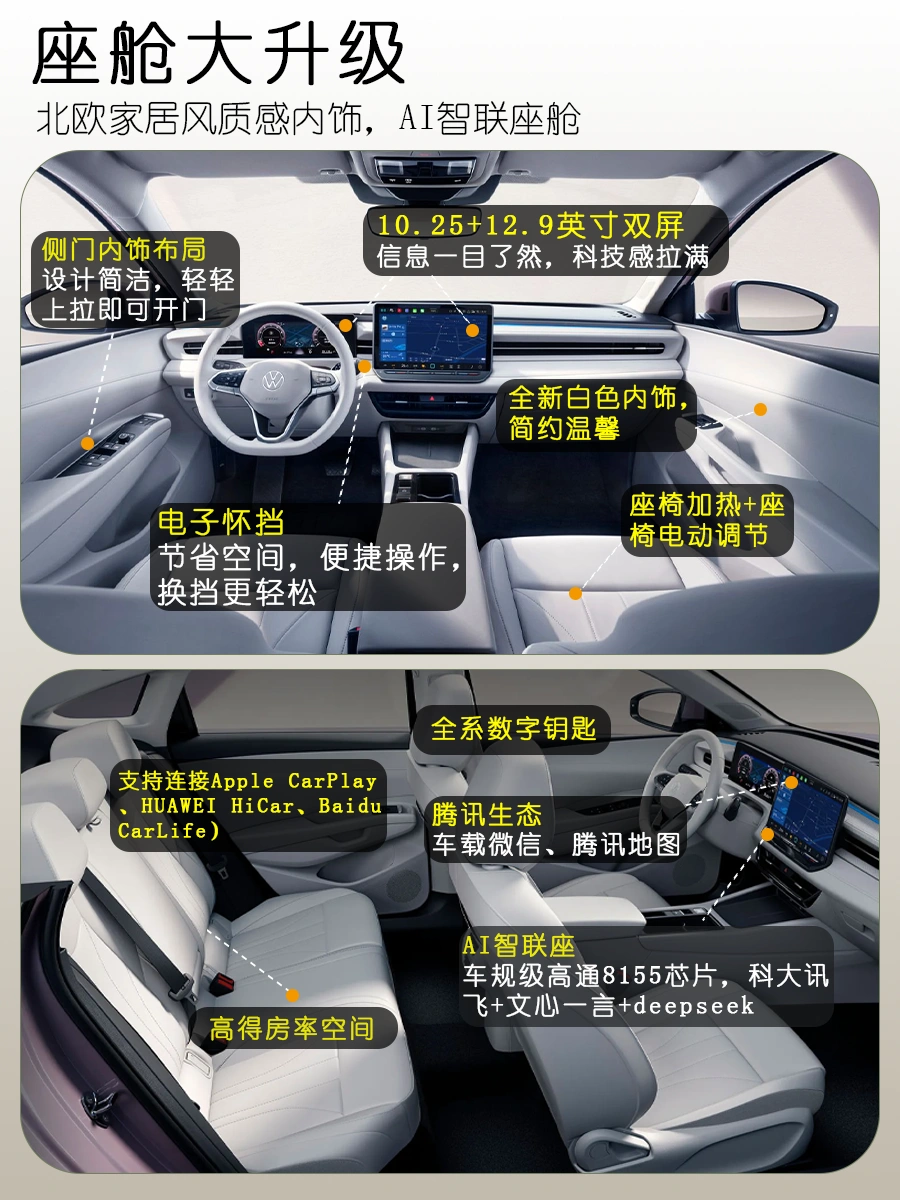 ✅内饰:科技与温馨并存的移动客厅全新白色内饰营造温馨质感,10.25英寸+12.9英寸双大屏显示清晰、操作流畅。电子怀挡设计不仅操作优雅,更为中控腾出更多储物空间,美观与实用兼具。
