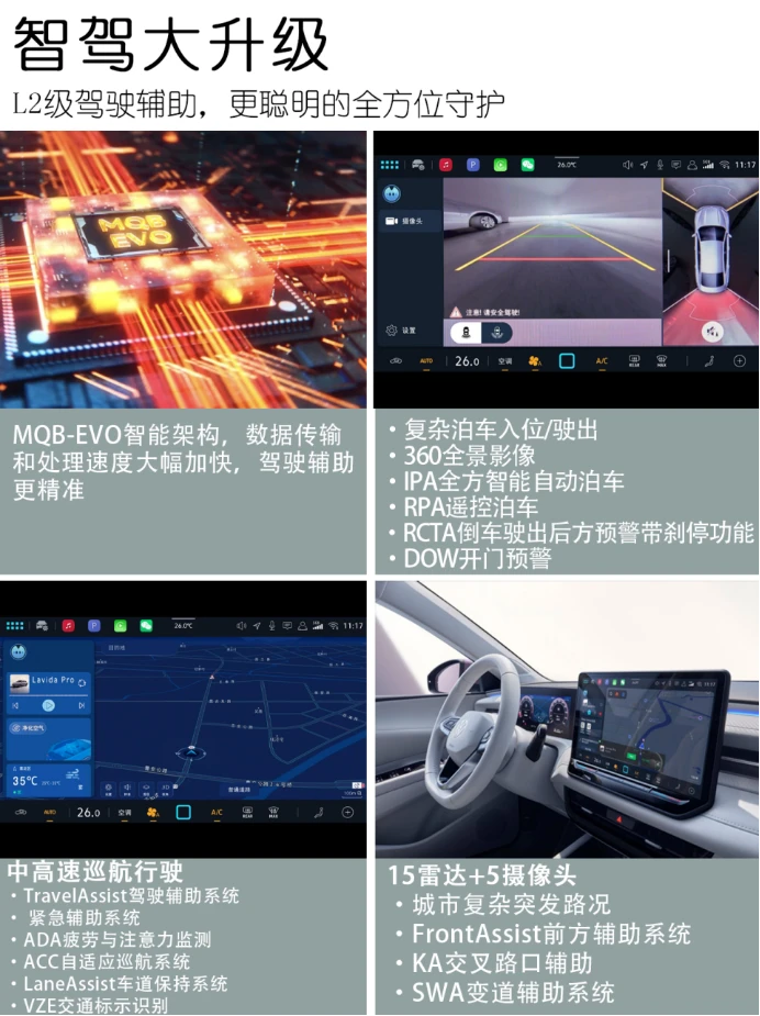 ✅智能:更聪明的全方位守护搭载高通8155芯片,集成科大讯飞语音技术、文心一言与deepseek深度思考模型,语音响应迅捷。L2级智能驾驶辅助系统包含ACC自适应巡航等功能,覆盖多数驾驶场景,配合360°全景影像,提升驾驶安全与便利。6.安全与品质:德系安全标杆,用车成本新低采用高刚性安全车身与7安全气囊(含前排中央气囊),提供全面防护。德系严谨造车工艺与严苛极限测试,配合领先制造精度与耐久防腐涂装,确保车辆经久耐用。