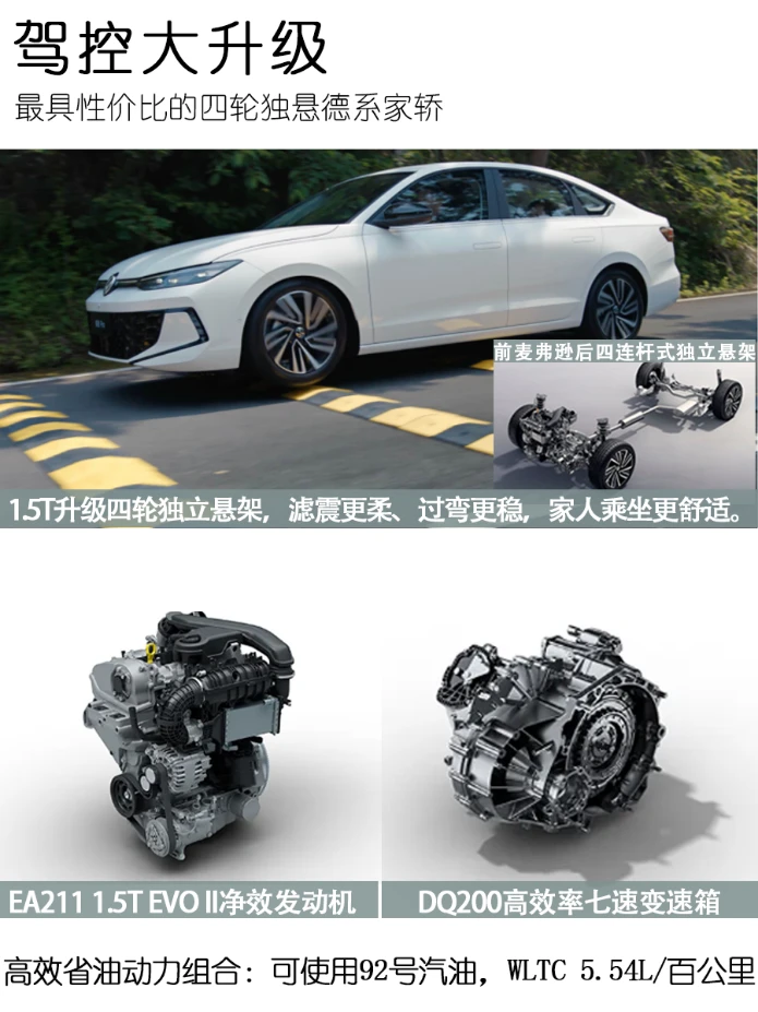✅底盘:舒适与安稳兼得1.5T版本升级为四轮独立悬挂,滤震更柔、过弯更稳,提升乘坐舒适性。搭配DQ200七速变速箱,驾控体验全面升级,成为同价位最具性价比的德系四轮独悬家轿。
