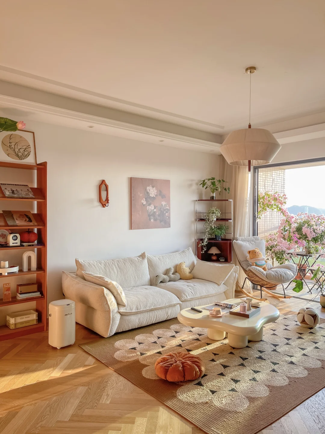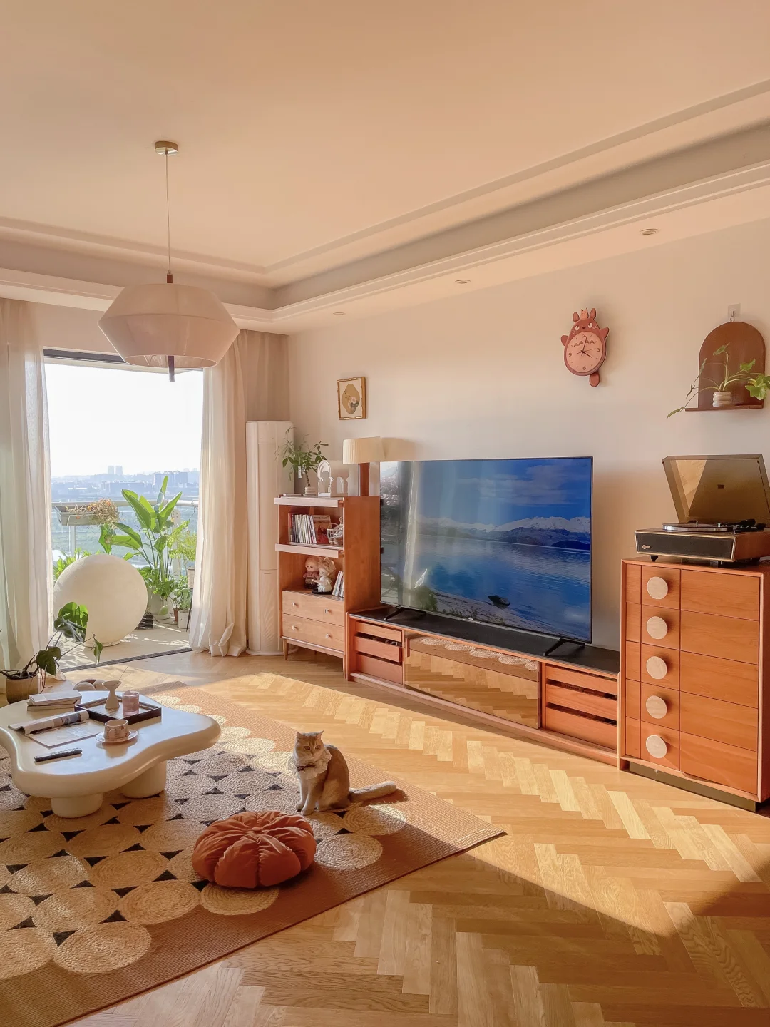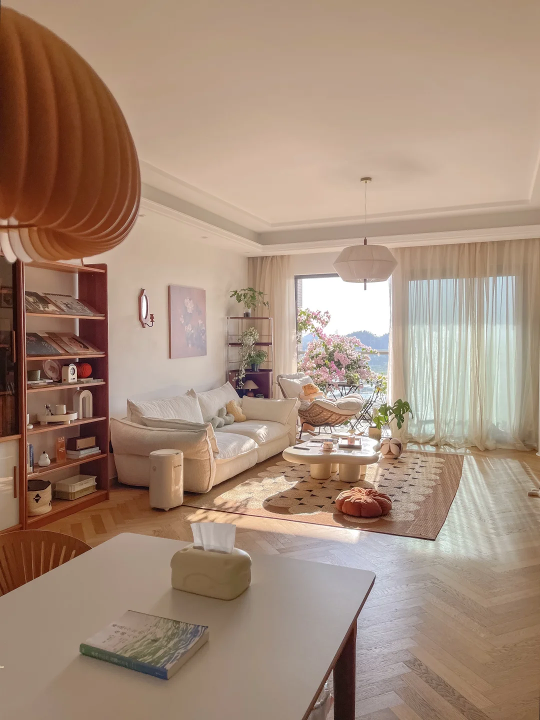 拥有属于自己的家真的很开心 终于过上了小时候梦寐以求的家了 亲手打造的成梦想中样子🌸 休息的时候最喜欢窝在沙发上追剧 看看窗外的风景真的很舒服呀 - 家是白棕色的原木风配色 精装房软装简单的搭配🏠 大白墙、通铺木地板、放个大沙发、暖色的地毯 还有一些原木色家居等~ 按照自己的喜好一点点布置💡 阳台养了一些三角梅和绿植…… 这样整个家都显得格外生机勃勃🍃 住进这样的家还有什么不开心的呢!