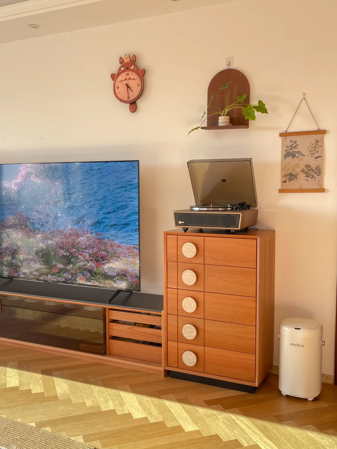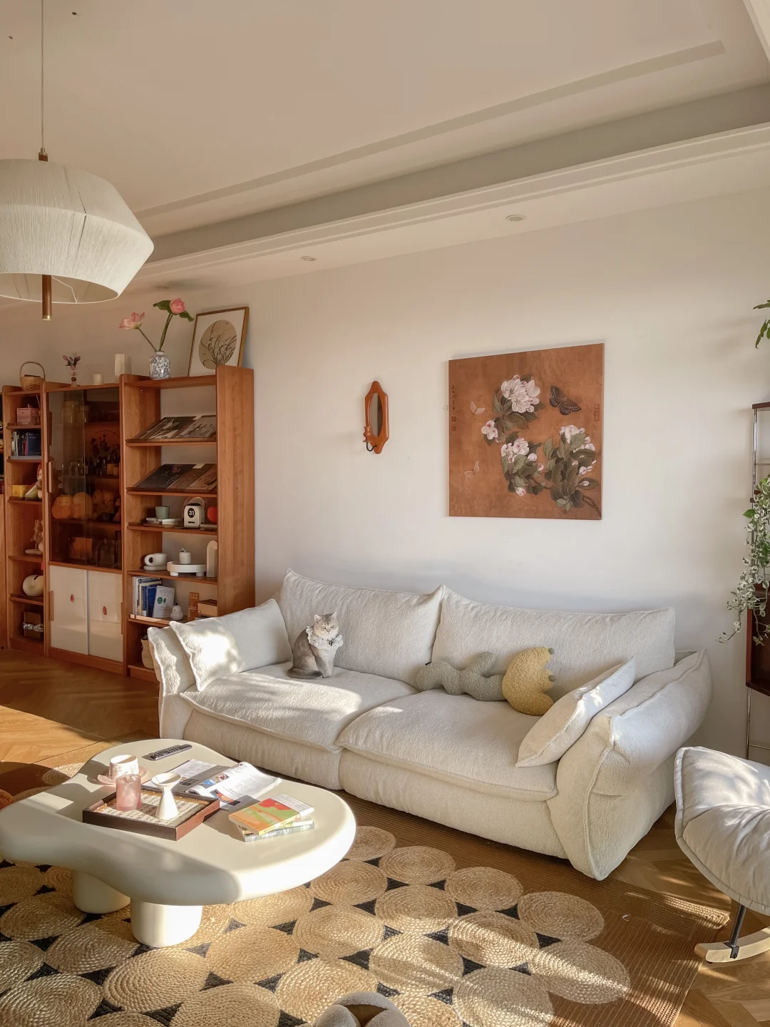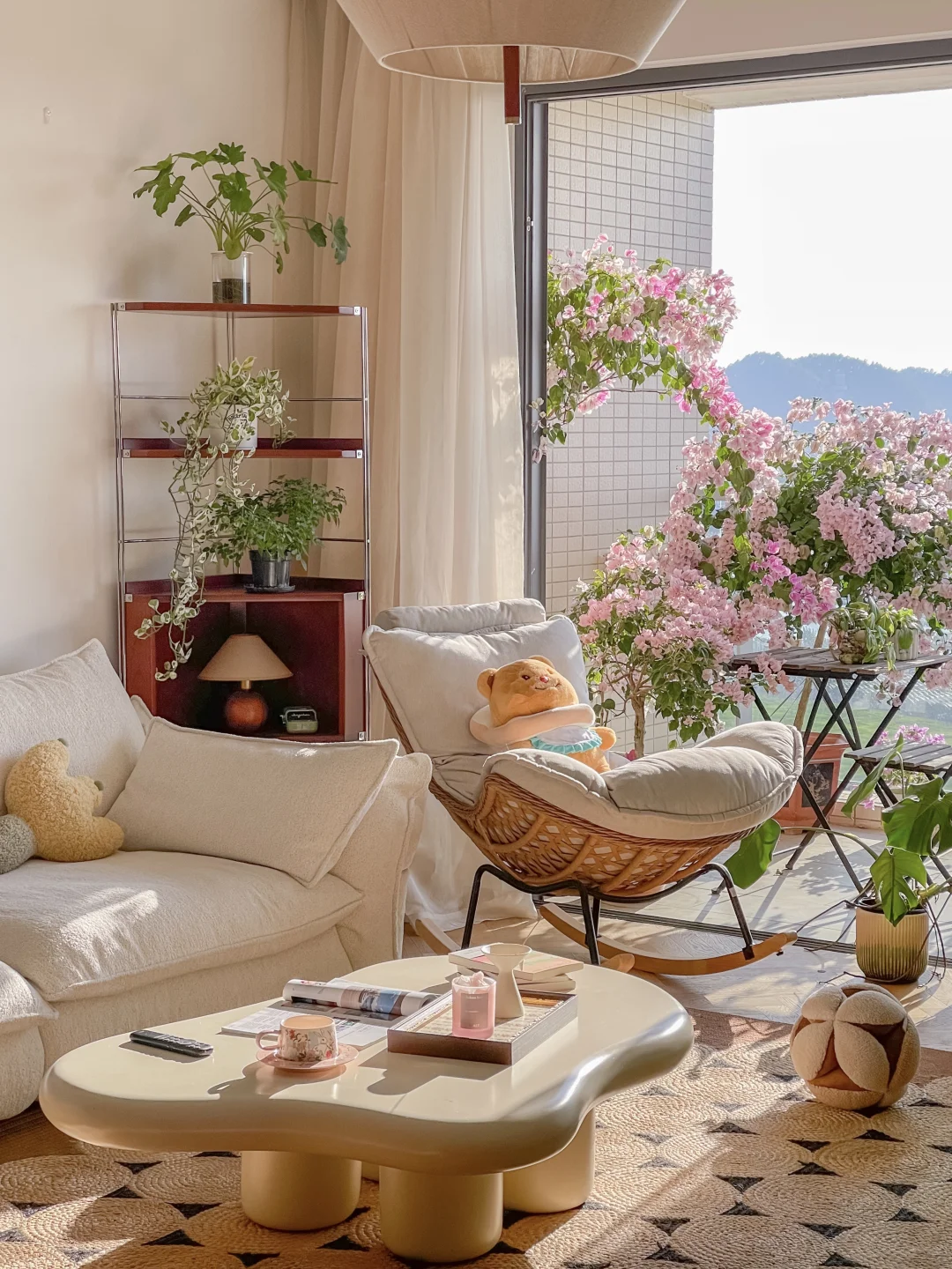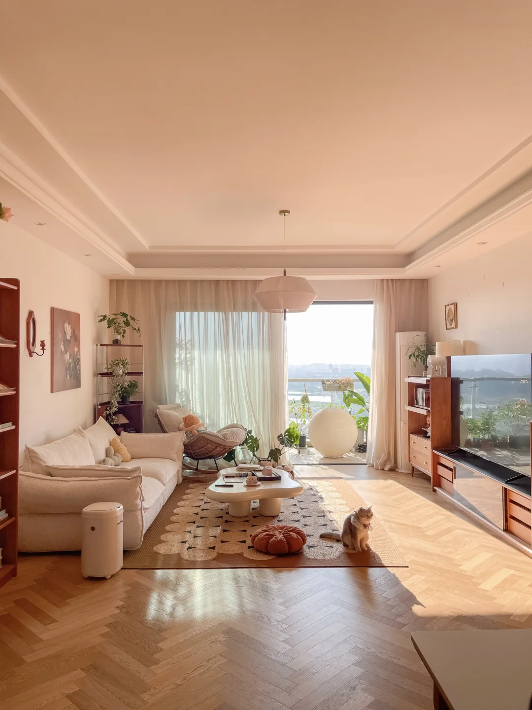 拥有属于自己的家真的很开心 终于过上了小时候梦寐以求的家了 亲手打造的成梦想中样子🌸 休息的时候最喜欢窝在沙发上追剧 看看窗外的风景真的很舒服呀 - 家是白棕色的原木风配色 精装房软装简单的搭配🏠 大白墙、通铺木地板、放个大沙发、暖色的地毯 还有一些原木色家居等~ 按照自己的喜好一点点布置💡 阳台养了一些三角梅和绿植…… 这样整个家都显得格外生机勃勃🍃 住进这样的家还有什么不开心的呢!