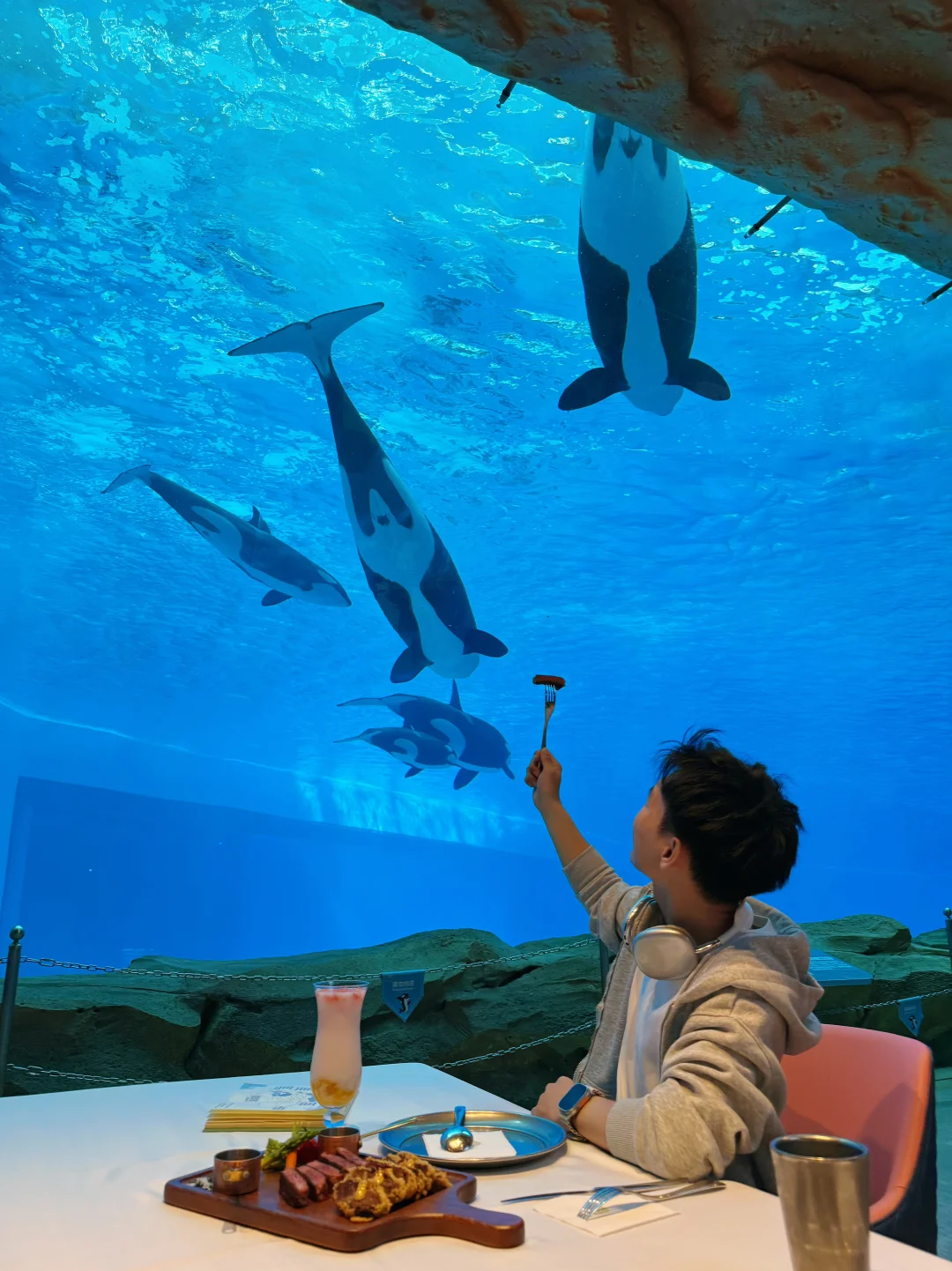 1️⃣鲸生鲸世:180度的海洋景色,坐在第一排,与虎鲸同框用餐仿佛置身于深蓝的海底随手一张都是人生大片。