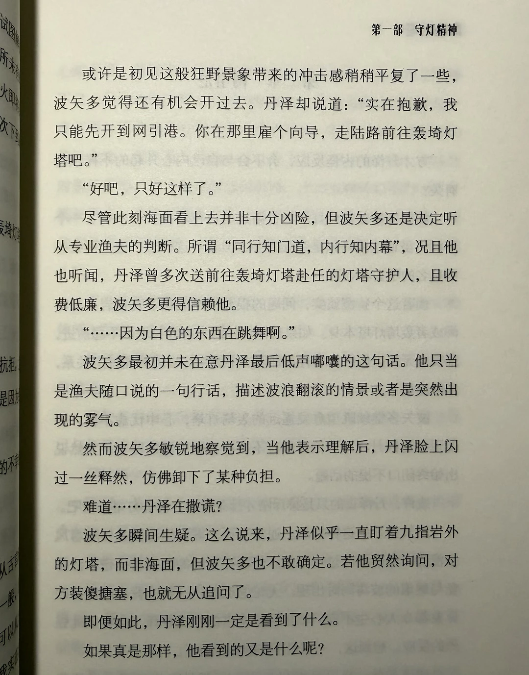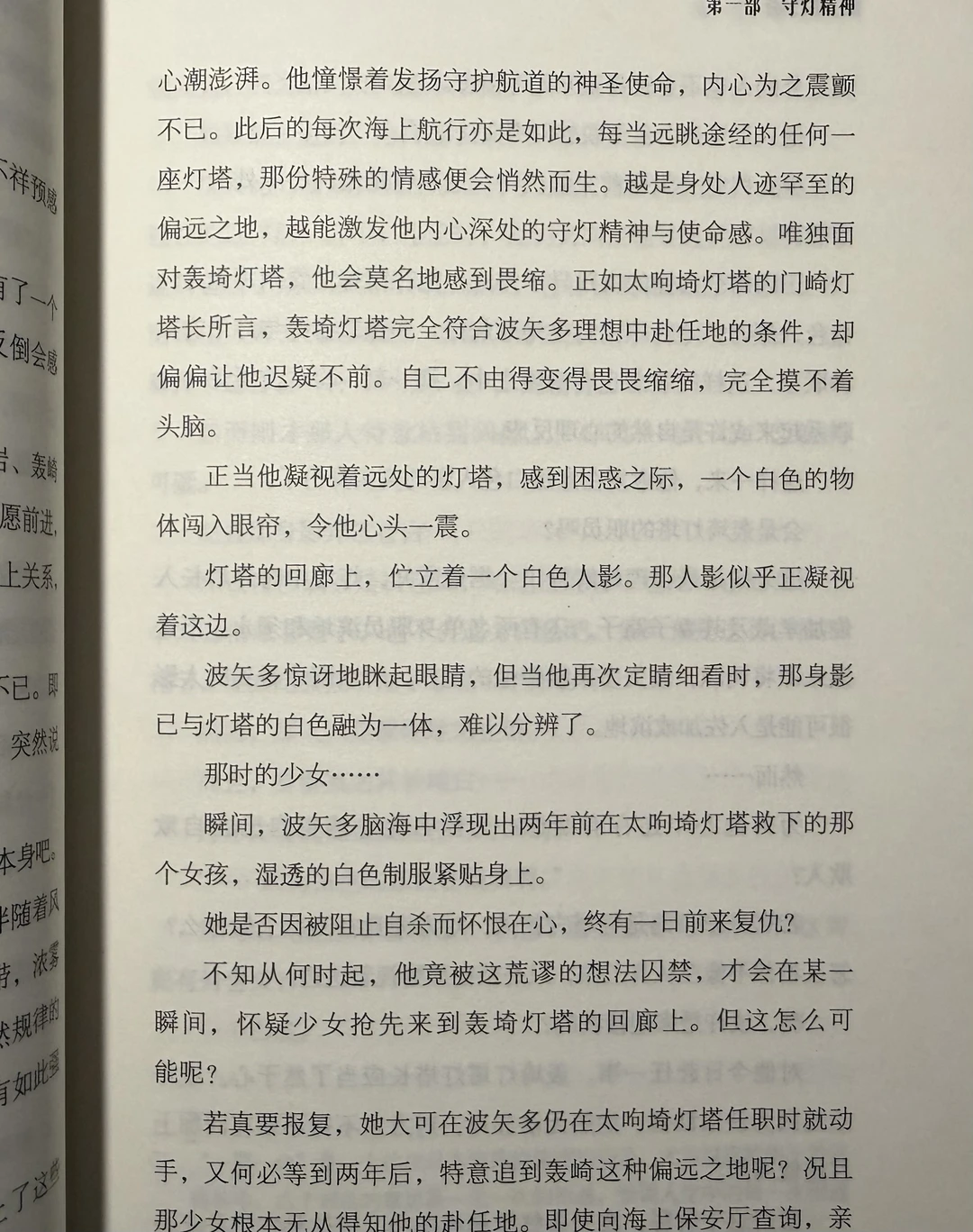 靠近轰之埼,船夫丹泽说了一句奇怪的话:“白色的东西在跳舞”,随即以海相不佳为由,建议波矢多绕道纲引港,徒步前往灯塔。