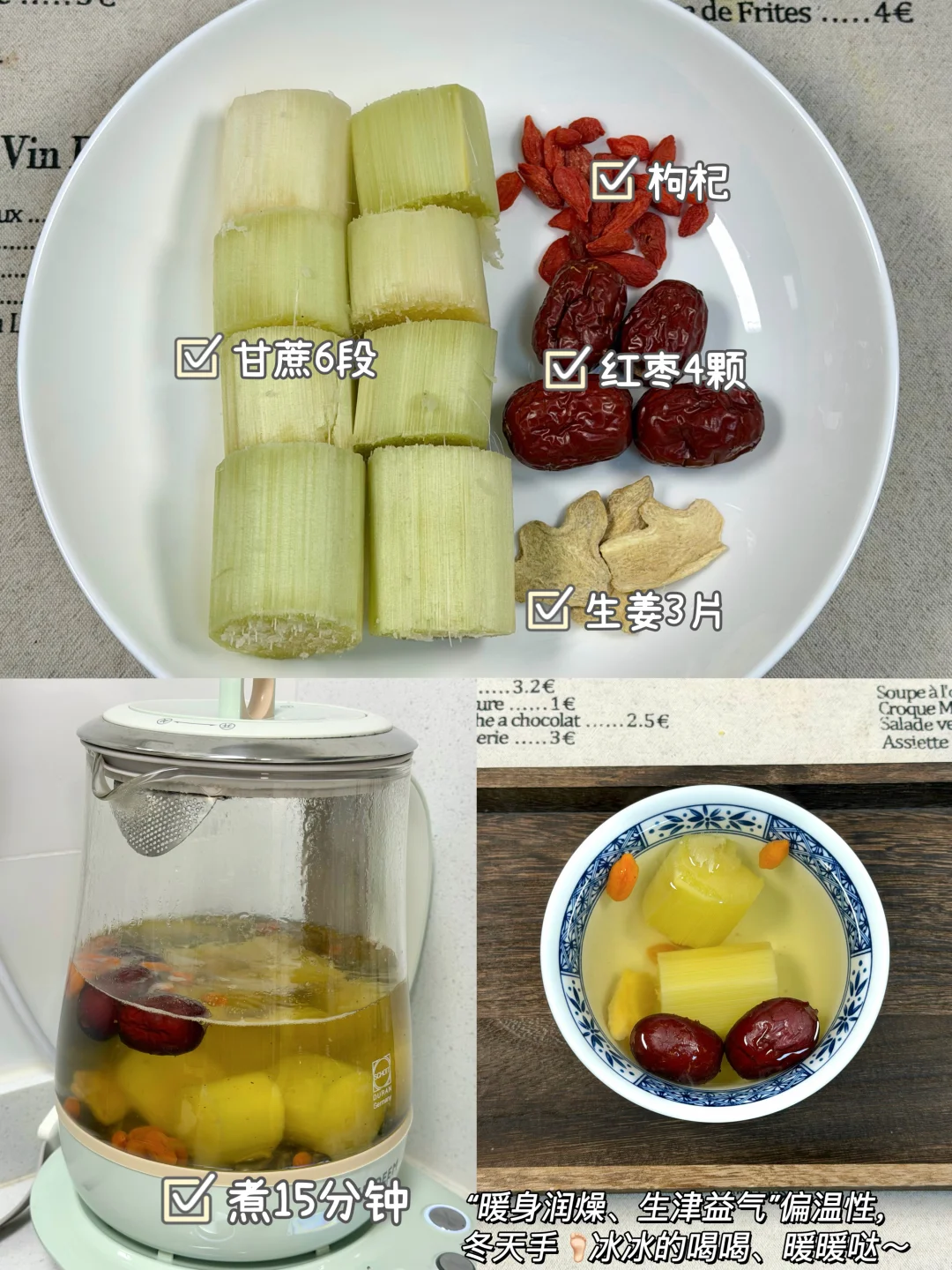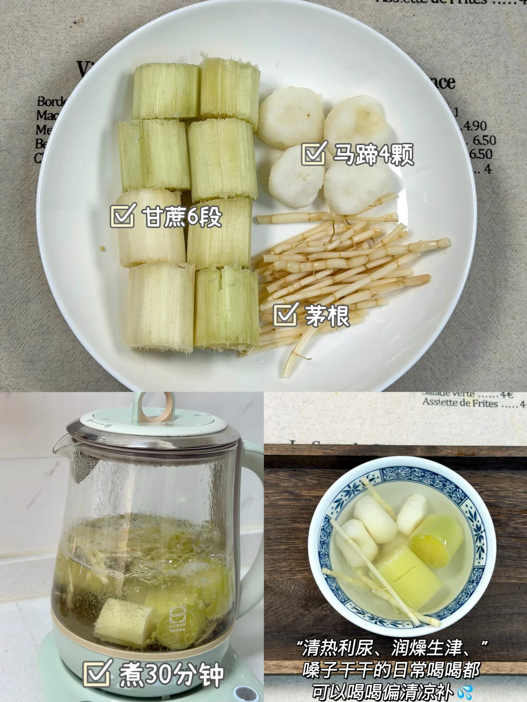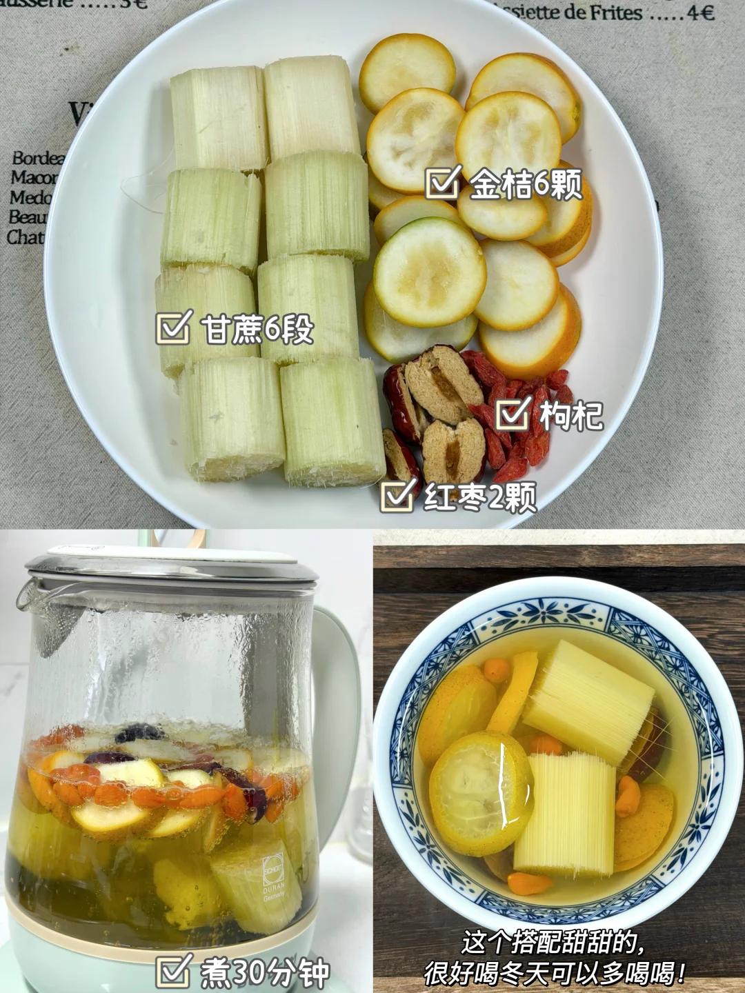 每年冬天我都会煮甘蔗水喝! 中医说:“冬天吃甘蔗是大补”。 冬天容易嗓子不舒服kkk的,皮肤干干的,可以跟着我喝喝这几款甘蔗煮水的搭配! ✅食材: 1️⃣甘蔗➕金桔➕红枣➕枸杞 2️⃣甘蔗➕马蹄➕茅根 3️⃣甘蔗➕玫瑰花➕红枣➕桑葚 4️⃣甘蔗➕雪梨🍐➕红枣 5️⃣甘蔗➕苹果🍎➕红枣➕枸杞 6️⃣甘蔗➕枸杞➕红枣➕生姜 ✅做法:做法真的很简单,食材放入锅中/养生壶煮30分钟即可。 ⚠️甘蔗: 紫皮甘蔗:偏温,适合虚寒的人! 青皮甘蔗:偏凉,清内🔥,适合有内热的人!