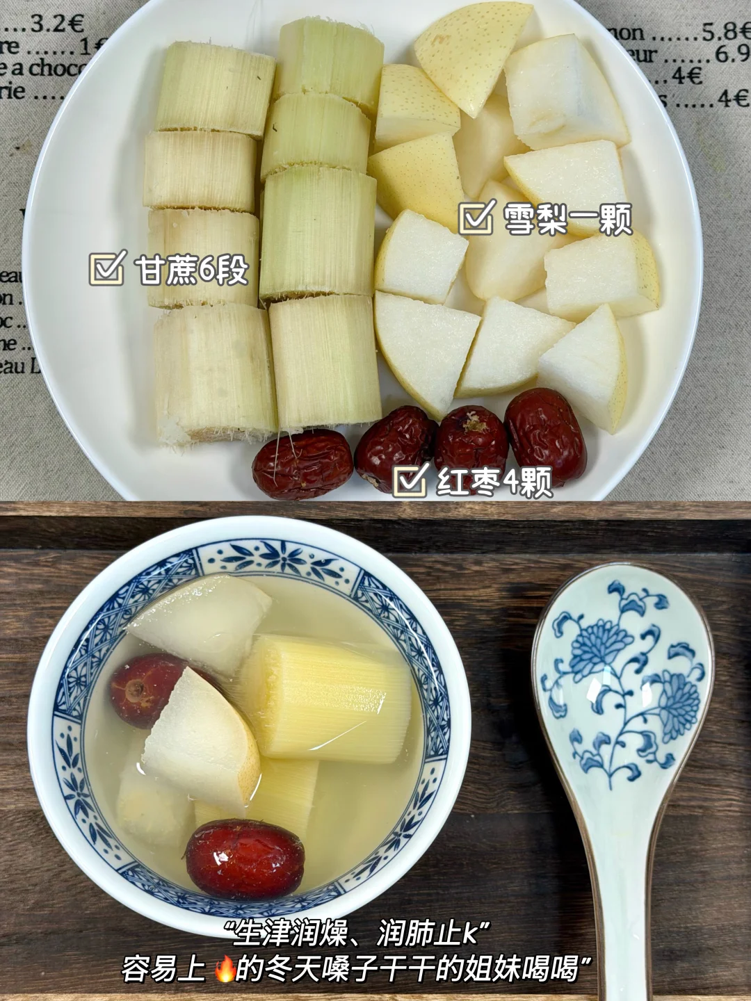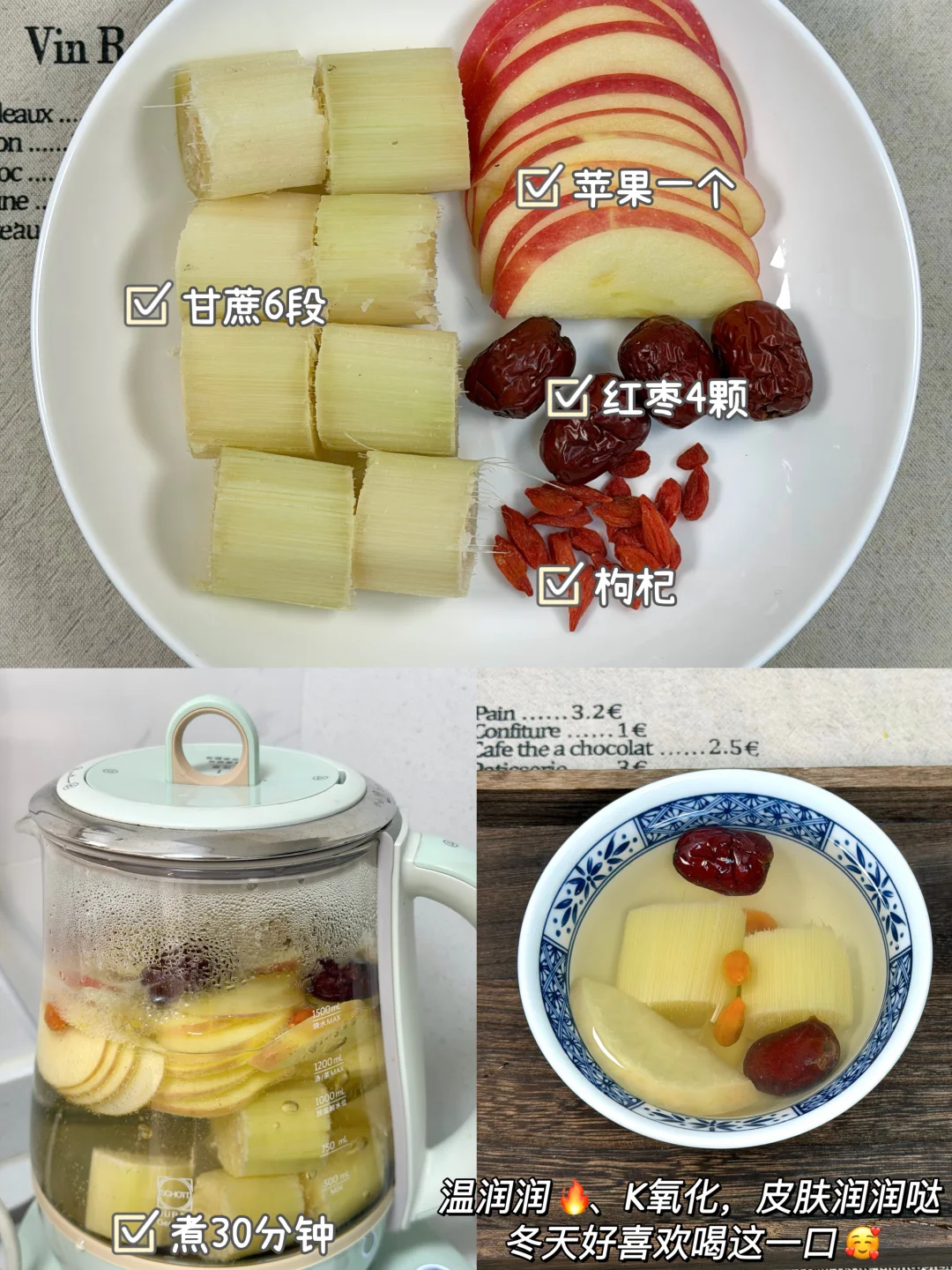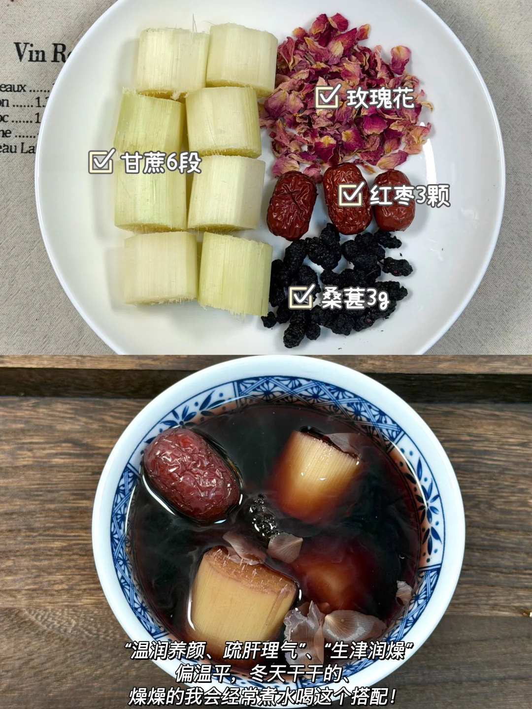 每年冬天我都会煮甘蔗水喝! 中医说:“冬天吃甘蔗是大补”。 冬天容易嗓子不舒服kkk的,皮肤干干的,可以跟着我喝喝这几款甘蔗煮水的搭配! ✅食材: 1️⃣甘蔗➕金桔➕红枣➕枸杞 2️⃣甘蔗➕马蹄➕茅根 3️⃣甘蔗➕玫瑰花➕红枣➕桑葚 4️⃣甘蔗➕雪梨🍐➕红枣 5️⃣甘蔗➕苹果🍎➕红枣➕枸杞 6️⃣甘蔗➕枸杞➕红枣➕生姜 ✅做法:做法真的很简单,食材放入锅中/养生壶煮30分钟即可。 ⚠️甘蔗: 紫皮甘蔗:偏温,适合虚寒的人! 青皮甘蔗:偏凉,清内🔥,适合有内热的人!