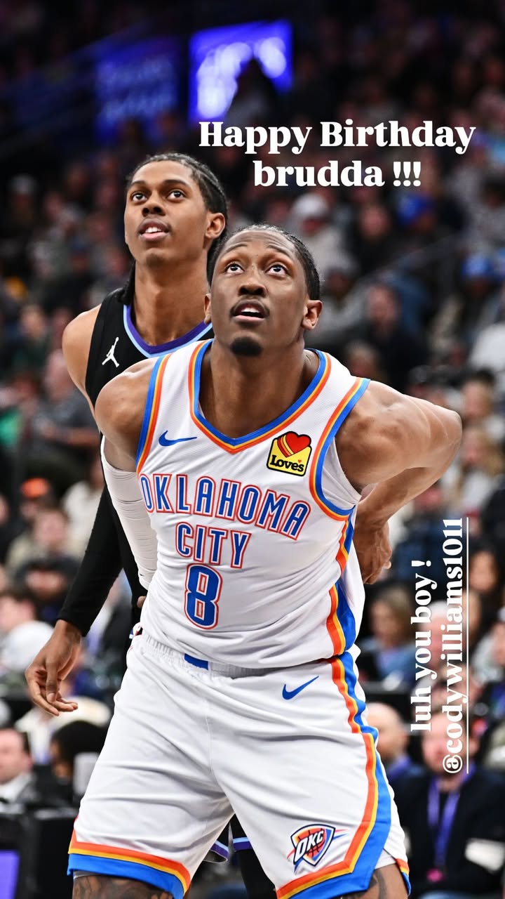 虎扑11月21日讯今日,雷霆球员杰伦-威廉姆斯社媒分享与弟弟科迪-威廉姆斯赛场同台照,为其送去生日祝福。
