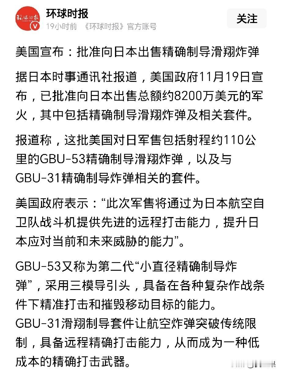 话少人怪狠。 中日关系胶着,美国不说话,却直接批准向日本出售军火武器,价值820