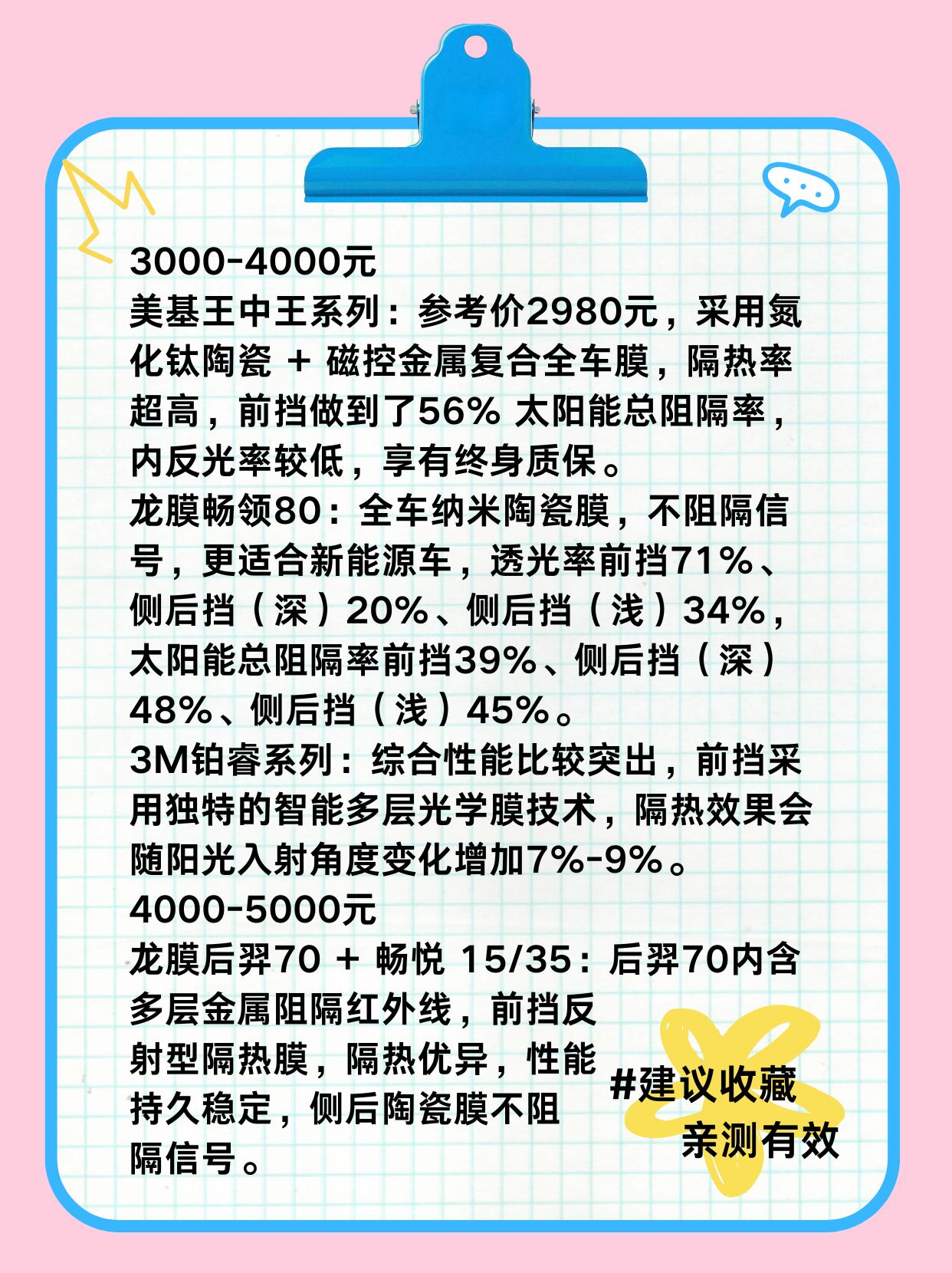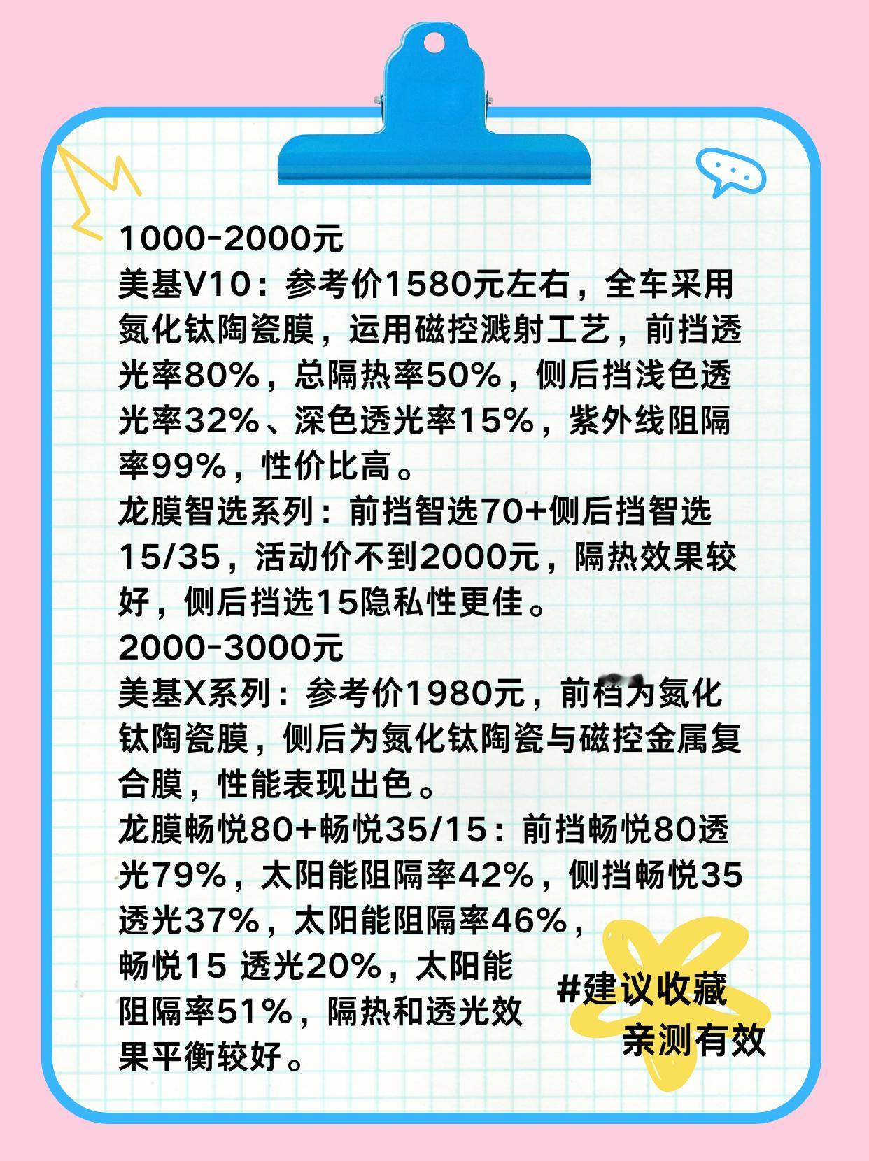 不同价位的车可以根据其自身特点和需求来选择适合的车窗膜,以下是一些推荐【来自懂车