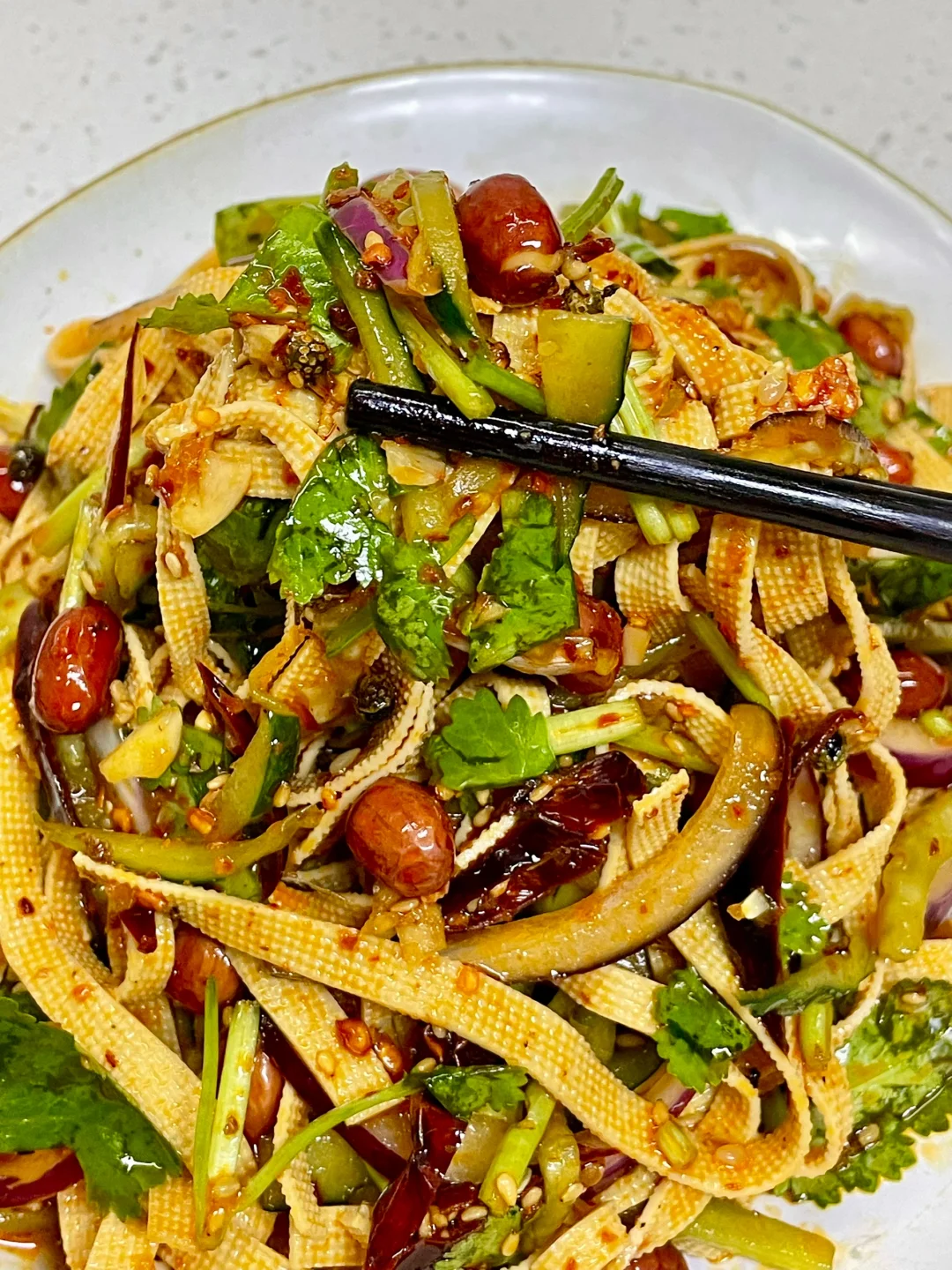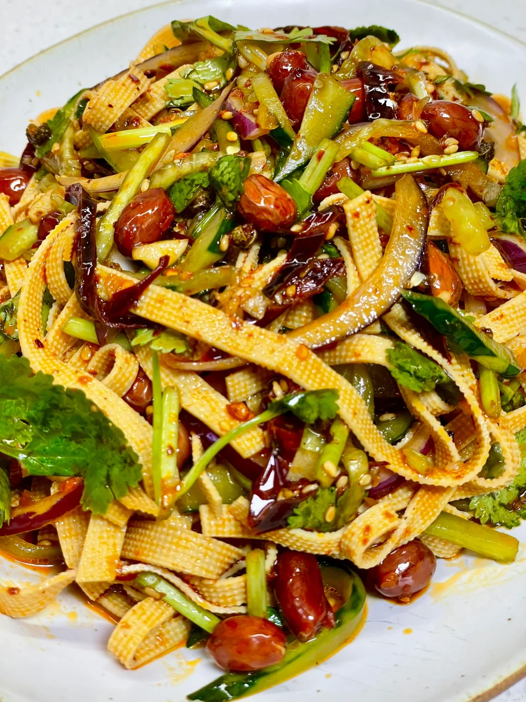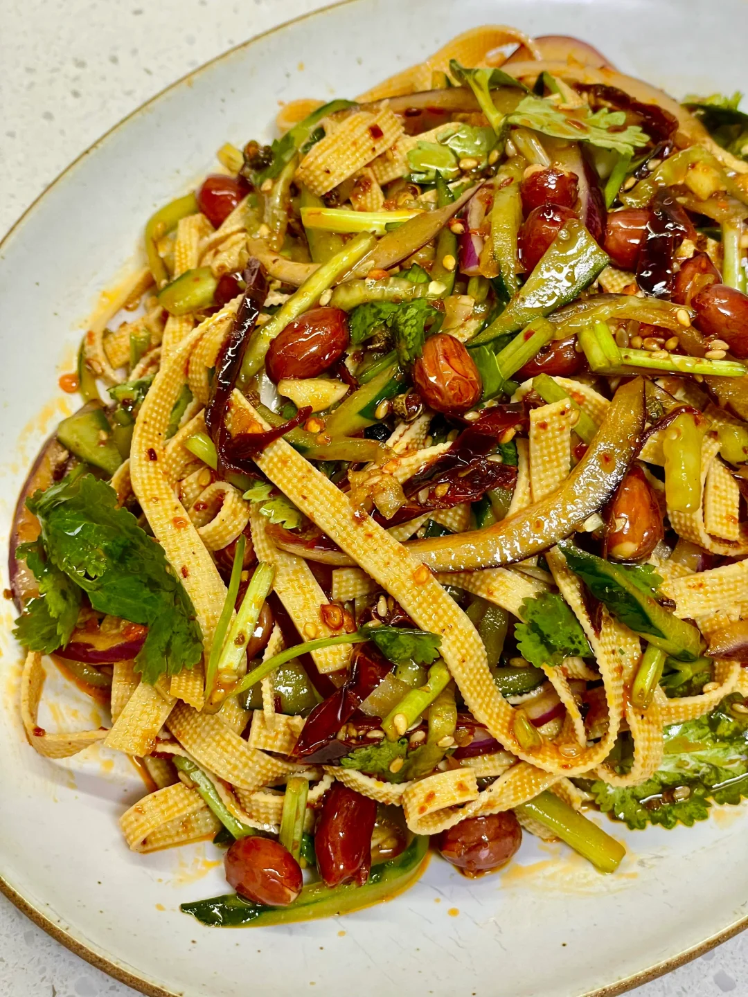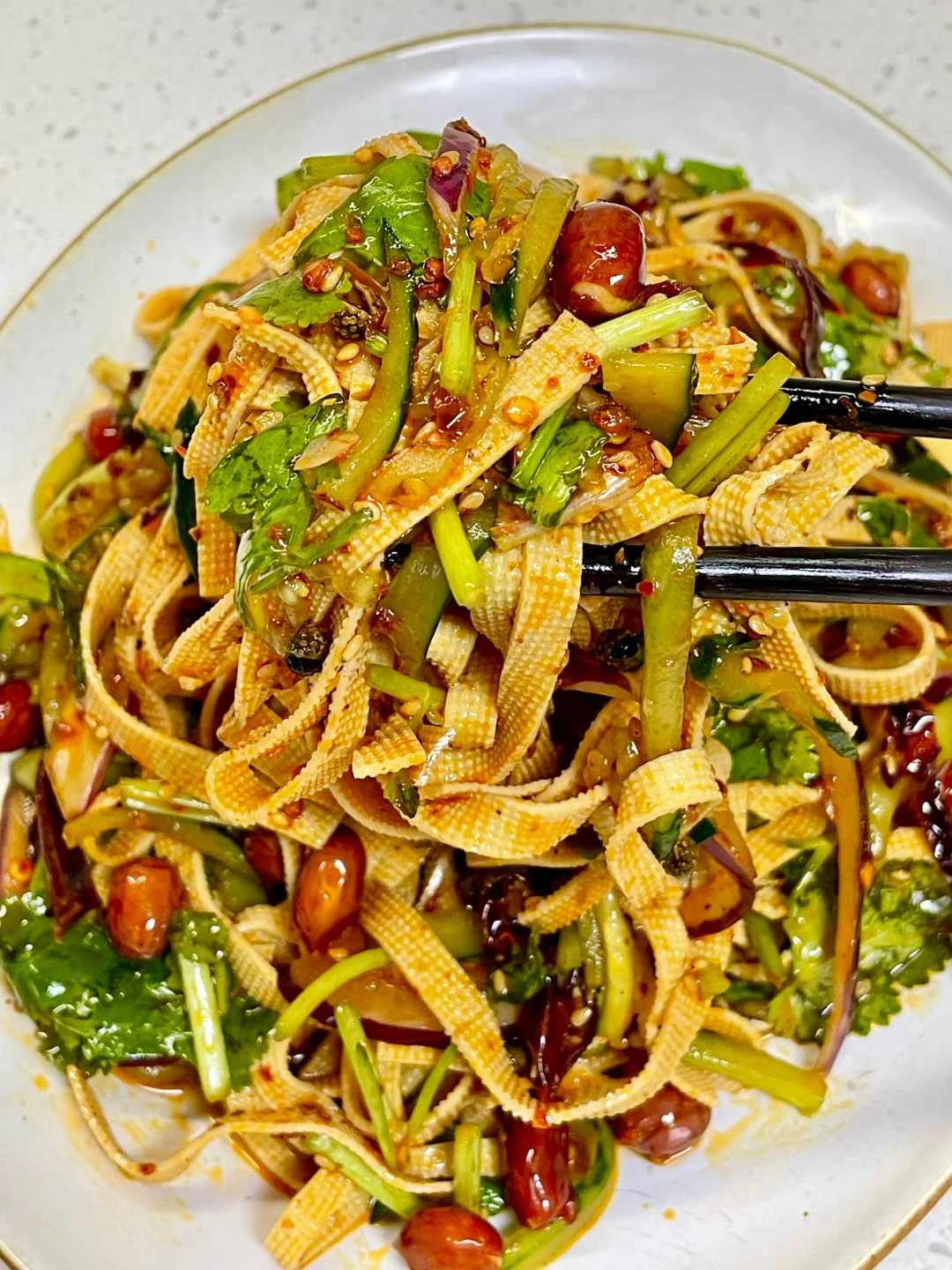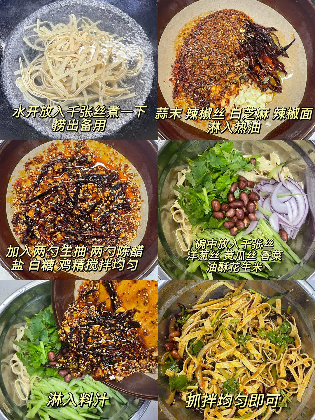 一年四季都不可或缺的凉拌菜,今天吃的是炝拌豆腐丝,做法简单,有手就会 1️⃣:水开放入千张丝煮一会儿捞出,碗中放入蒜末白芝麻 花椒 辣椒丝 辣椒面淋入热油,加两勺生抽 两勺陈醋 适量盐 白糖 鸡精搅拌均匀 2️⃣:千张丝 黄瓜丝 洋葱丝 香菜 花生米放入碗中,淋上料汁抓拌均匀即可