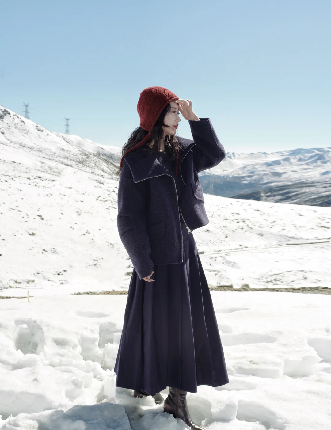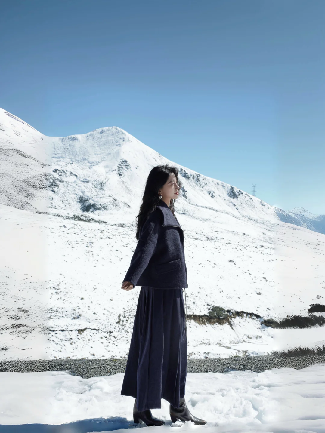 当折多山巨大的雪顶闯入视野时,整个世界骤然安静。我停下車,任沉澈的衣蓝与圣洁的雪白、辽阔的天蓝静静映衬。它不言语,只是亘古地矗立,将那份冷冽的圣洁映入我瞳孔,也照进心底。外套裹挟着风中寒意,那些纠缠的焦虑、俗世的纷扰,在雪线之上,仿佛被这抹深蓝过滤,瞬间失重,化作云烟。