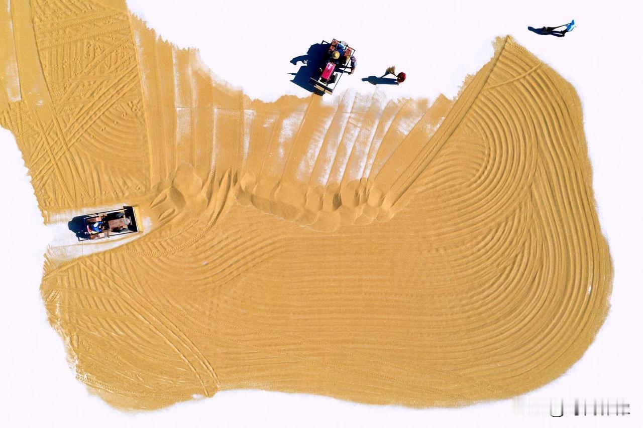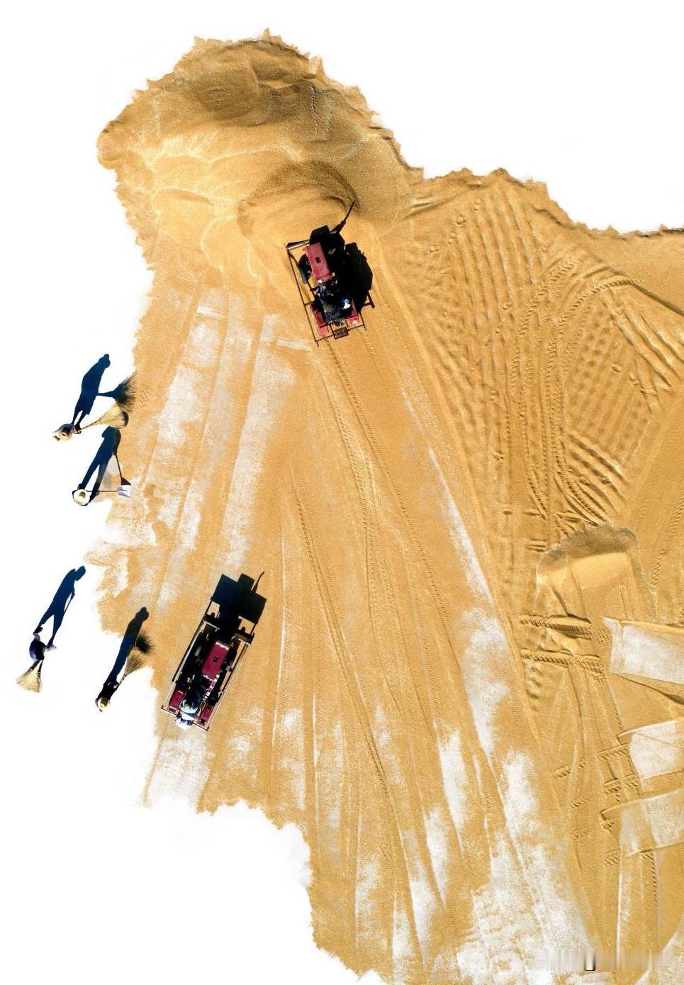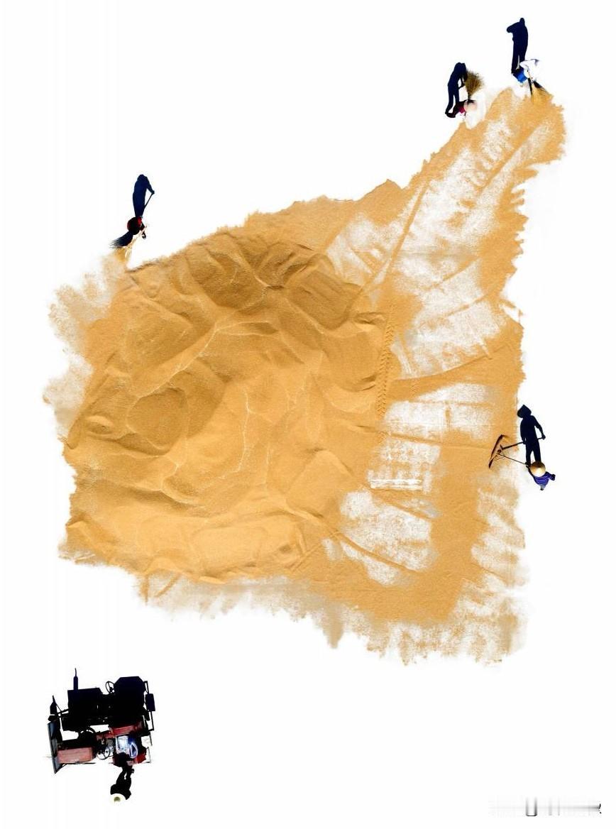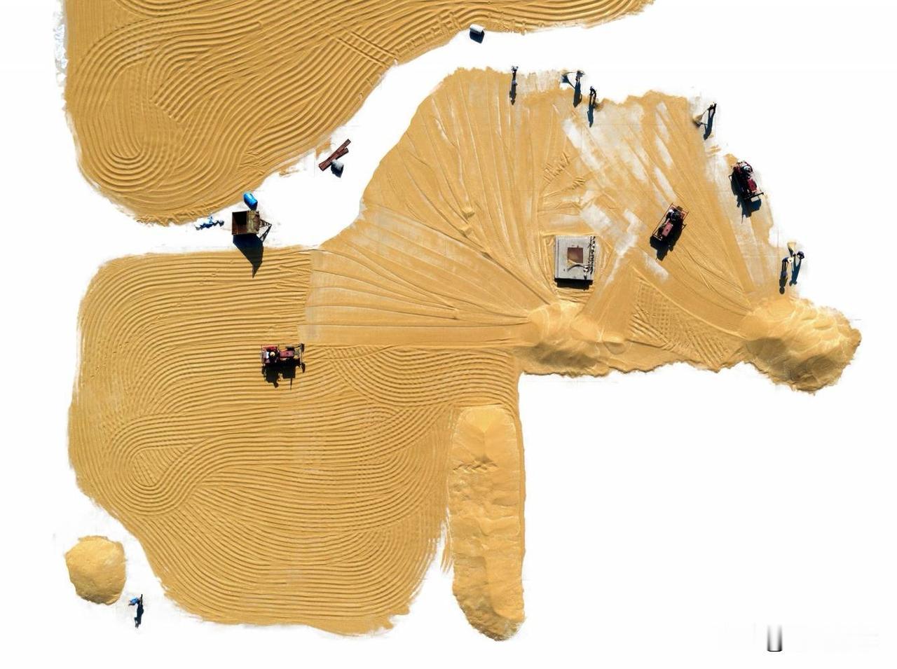 第十六届山东省摄影艺术展艺术类铜质奖《麦场写意》评语: 作品以鸟瞰视角表现山东莱西小麦丰收的壮观场景,将现实的小麦晾晒场转化为一幅幅恢弘的写意画作,画面既具抽象构成的现代感,又饱含浓郁的土地情怀。摄影师在影像后期制作中有意隐去水泥地面,使晾晒场上成堆的金黄色粮食在航拍的视角下被提炼为一个个纯粹而强烈的独具风格化的图案,强化了色彩的整体感与点、线、面的视觉节奏,犹如挥洒自如的大写意笔触,不仅强化了视觉形式美感与艺术张力,更使丰收的气息扑面而来,将丰收的喜悦转化为可触可感的视觉盛宴。(作者:张言哲)