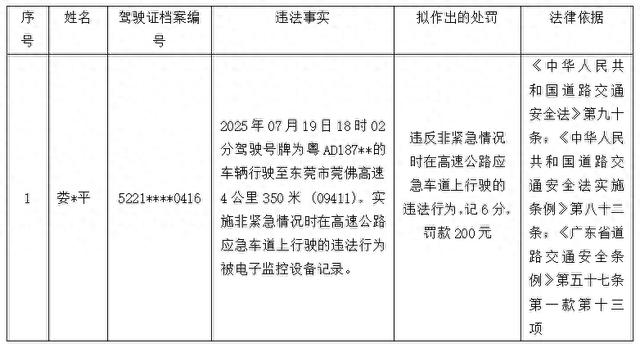 驾驶人娄*平,驾驶贵州千禧绿色环保出租汽车服务有限公司广州分公司的粤AD187**的车辆,因道路交通违法行为被电子设备记录,当事人未在限定期限内接受处理。根据《中华人民共和国行政处罚法》第四十四条、《公安机关办理行政案件程序规定》第一百八十条等规定,现将其对应违法事实、理由和处罚依据公告告知如下,根据《中华人民共和国行政处罚法》第四十五条的规定,当事人有提出陈述和申辩的权利。如提出陈述和申辩,请自公告之日起七日内向东莞市公安局交通管理支队高速公路二大队(地址:东莞市大岭山镇厚大路458号,联系人:刘警官、何警官,联系电话:0769-83226812)提出,逾期不提出的视为放弃陈述和申辩。