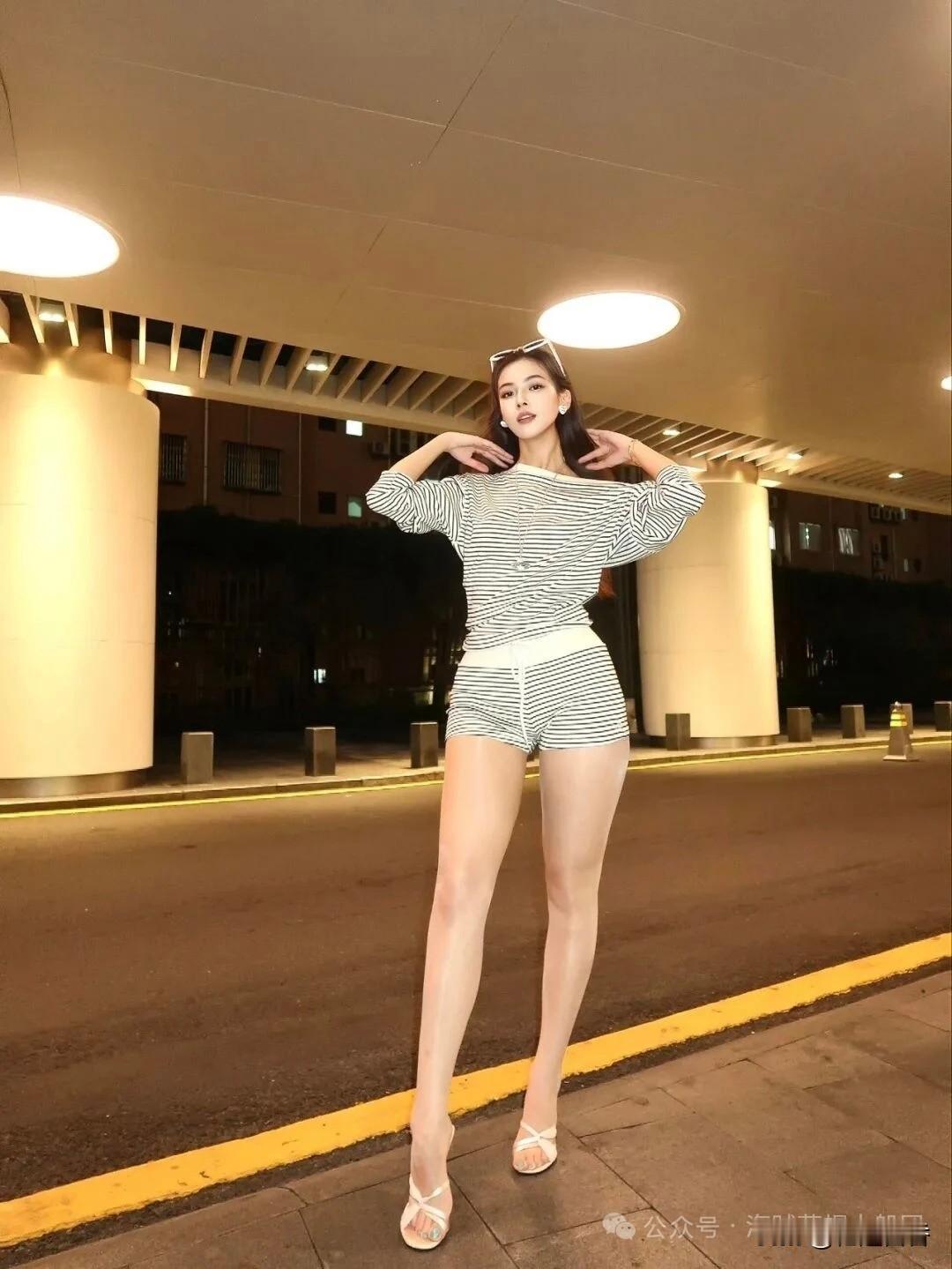 夜晚街拍,时尚条纹露肩上衣搭配短裤,优雅气质满满!