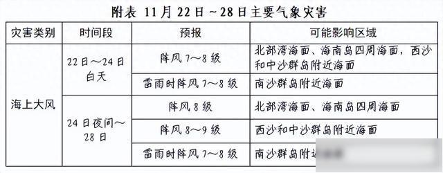 22日至24日白天,海南岛四周海面、北部湾海面、西沙和中沙群岛附近海面,风力5~6级、阵风7~8级;南沙群岛附近海面,风力5级、雷雨时阵风7~8级。