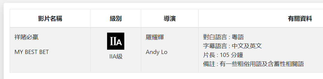 11.29香港电影 影片信息(9点上片)外文片名:祥賭必贏国 别:中国香港香港公映日期:2025-01-28类 型:喜剧评 级:IIA片 长:102分钟(港版105分钟)幕 幅:宽银幕声 制:5.1语 别:粤语、国语发行版本:数字2D放映期限:2025年11月29日 09:00- 2025年12月28日