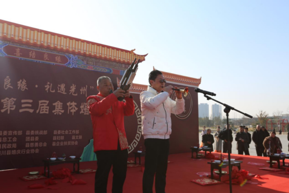 初冬光州,寒意渐浓却暖意融融;弋阳公园,喜韵盎然且新风涌动。11月21日,“新风良缘・礼遇光州”信阳市潢川县第三届集体婚礼在弋阳公园温馨举行,9对新人以简约庄重的仪式定格幸福瞬间,用实际行动践行婚俗新风,为光州大地增添了浓厚的文明气息。县领导吴永阳、李甚利、刘俊、齐新峰、李成强、陈红出席活动,共同见证新人幸福时刻。