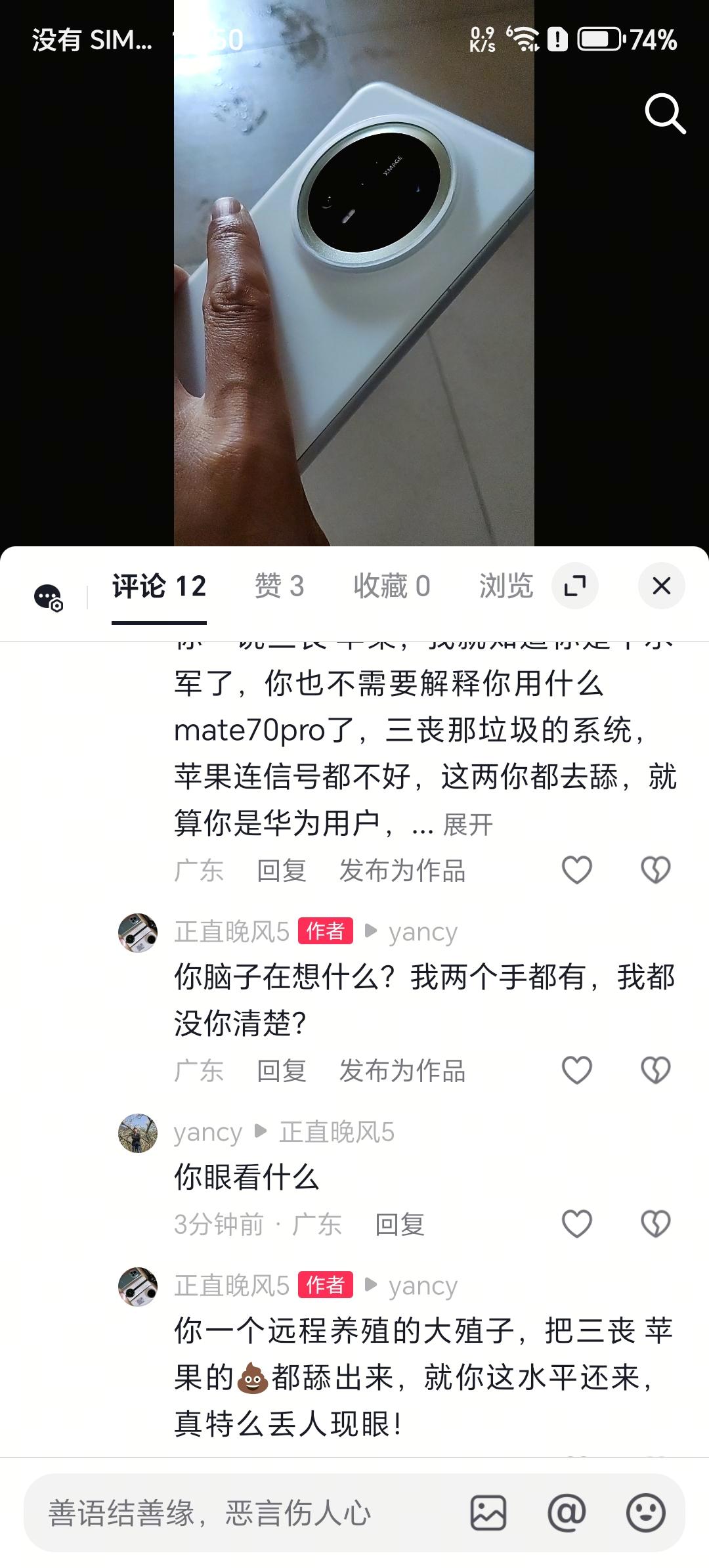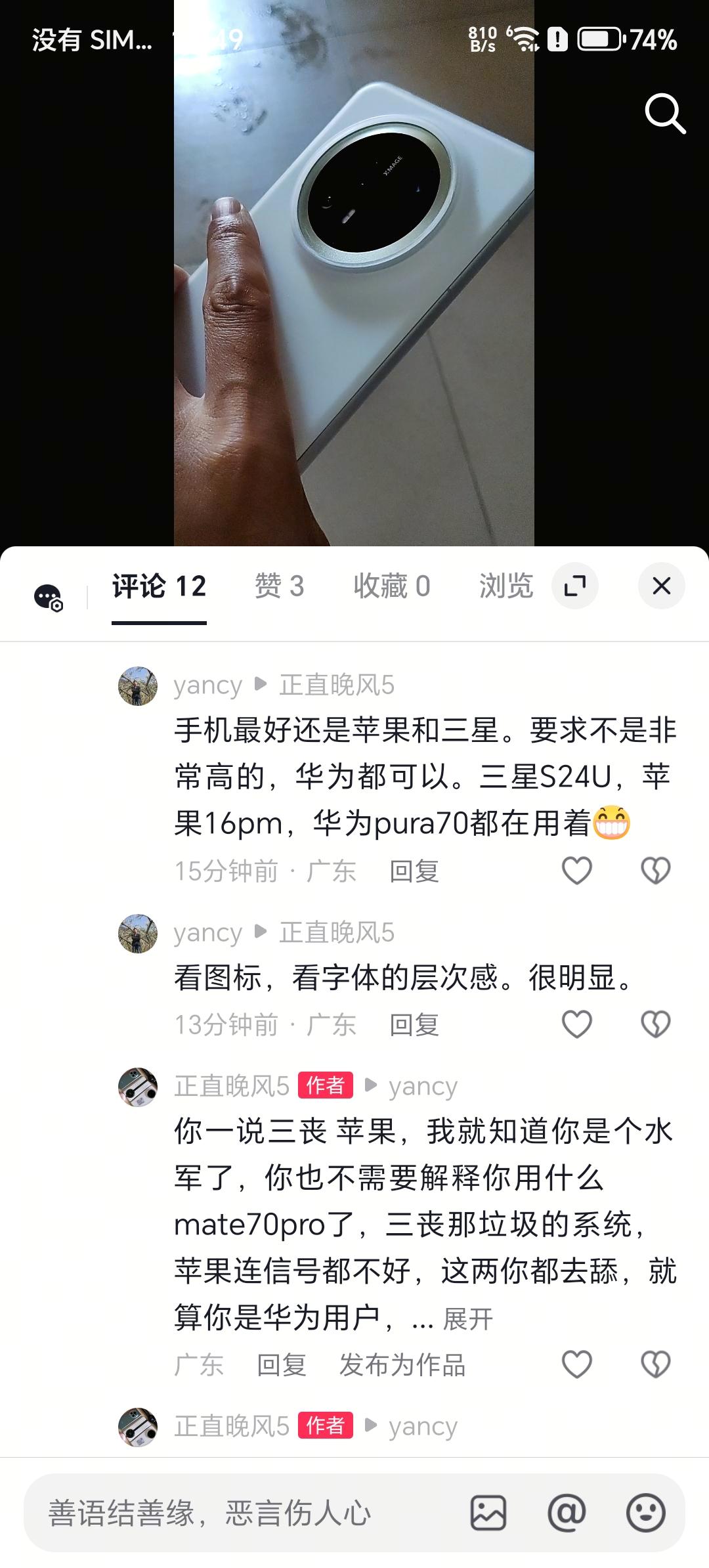 我就知道这个是水军了,我刚开始以为他是来正常交流的,说什么mate70pro+的屏幕比Pura80ultra要好,还来一句三丧和水果手机是最好的手机 我不好意思,我是直接开怼的,我管你是不是华为用户,一个只会舔的人,我是不会给你任何情面的!