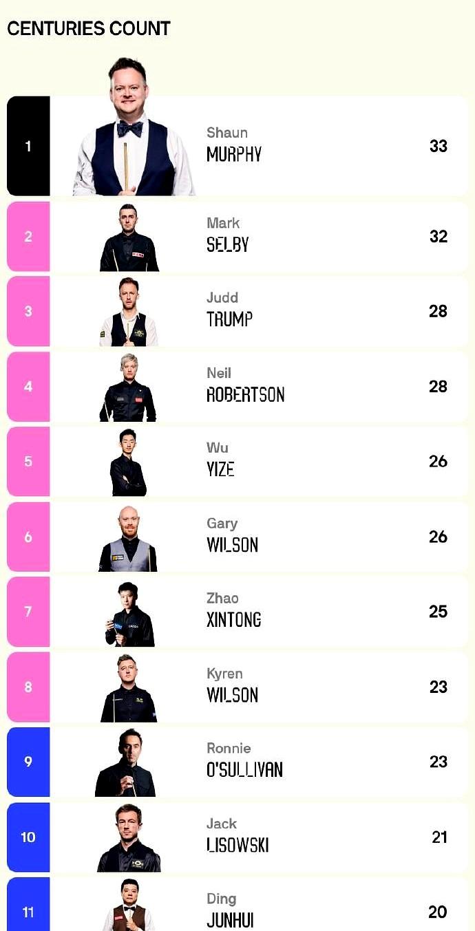谁能想到,2023/24赛季斯诺克单杆破百榜第一的是肖恩·墨菲?这位“魔术师”以58杆甩了塞尔比9杆,国锦赛决赛怼奥沙利文都轰了3杆,效率比上赛季猛多了——现在每7.2局就破百一次。塞尔比排第二,也打破了只会防守的刻板印象。中国选手这边,00后吴宜泽居然冲到第五,37杆里国锦赛占14杆,后生可畏。丁俊晖大师赛加2杆到29杆,排第九也算稳。再看格局,75三杰只剩奥沙利文在第六,希金斯都没进前十,新生代这波冲击真不是闹着玩的。这说明斯诺克的进攻潮流挡不住,年轻人敢打敢拼,老炮们不转型真要被甩在后面了。