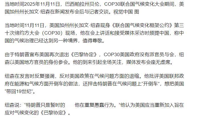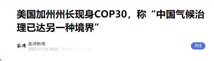特朗普做梦都想不到,11月11日,美加州州长不顾白宫警告单独参加第30届联合国气候变化大会,全程赞扬中国却狠骂美国。   2024年7月加州那场"帕克"山火至今让人心有余悸,短短五天就烧光1510平方公里土地,比两个纽约市还大,成了加州史上第六大火灾。   2.6万居民连夜疏散,浓烟裹着灰烬飘遍西海岸,空气里全是焦糊味。   可华盛顿那边呢?特朗普一口咬定"气候变化是骗局",不仅把联邦气候资金砍得精光,这次COP30干脆不派高级代表,等于把全球气候治理的话语权随手扔了。   加州是美国的"经济发动机",可它的绿色转型早就离不了中国的助力,最直观的就是洛杉矶港的变化。   作为美国对华贸易的门户,这里曾常年被柴油货轮的黑烟笼罩,工人下班浑身都是油污味。   2022年上海港和洛杉矶港联手开通"绿色航运走廊",用清洁能源船替换老货轮后,光上海港那边的碳排放就降了近四分之一。   现在这条航线每周开9班船,2024年的货运量比两年前还涨了不少,加州人总算明白:低碳转型压根不耽误赚钱。   新能源汽车领域的合作更让纽森赞不绝口。加州早定下规矩,2035年起只卖零排放汽车,这里的电动车保有量占了全美四成以上,比后面十个州加起来都多。   中国新能源汽车产销连续8年全球第一,电池技术更是顶尖,这些年中资企业在加州建电池厂、铺充电网,特斯拉上海超级工厂还能反过来给加州提供技术支持。   纽森在会上摊开数据:加州每卖出三辆电动车,就有一辆用的是中国技术。这种能实打实减排的硬实力,比美国政府的空口号管用一百倍。   早年加州的"总量和交易"机制曾给中国碳市场启发,现在中国碳市场越做越大,还把减排做成了能创造岗位的产业,加州又转头借鉴我们的区域联动经验。   要知道加州清洁能源产业养活了150万人,特朗普砍气候资金,砍的其实是加州人的饭碗,这换谁能不急?   纽森敢这么硬刚白宫,腰杆硬得很。加州GDP占全美14%,比澳大利亚都富,就算没联邦支持,自己也能搞气候合作。   更重要的是他有民心,加州有全美最多的华裔,超过110万人,占全美华裔总数近四成,人文联系从来没断过。   从19世纪华工用血汗修通太平洋铁路,到现在中资在清洁能源、生物医药领域大把投资,这种相互依存的关系,哪是特朗普一句"脱钩"就能切断的?   去年特朗普放话要逮捕他,纽森直接回怼"来抓我啊",就是摸准了加州人站在他这边。   这次COP30上,纽森不光夸中国,还跟中国代表签了海上风能、高铁合作的意向书,摆明了要绕过白宫搞"地方外交"。   这背后其实是全球气候治理的新趋势:当某些国家把政治私利放在民生之上,地方政府自然会寻找真正的合作伙伴。   中国用"双碳"目标和实打实的产业实力,成了全球气候治理的稳定力量,这才是加州主动靠过来的根本原因。   老百姓要的是蓝天碧水,企业要的是发展机遇,谁能提供这些,谁就有真正的领导力。逆着历史潮流走,迟早会被时代甩在身后,这道理,纽森懂了,加州人懂了,可惜特朗普还没懂。
