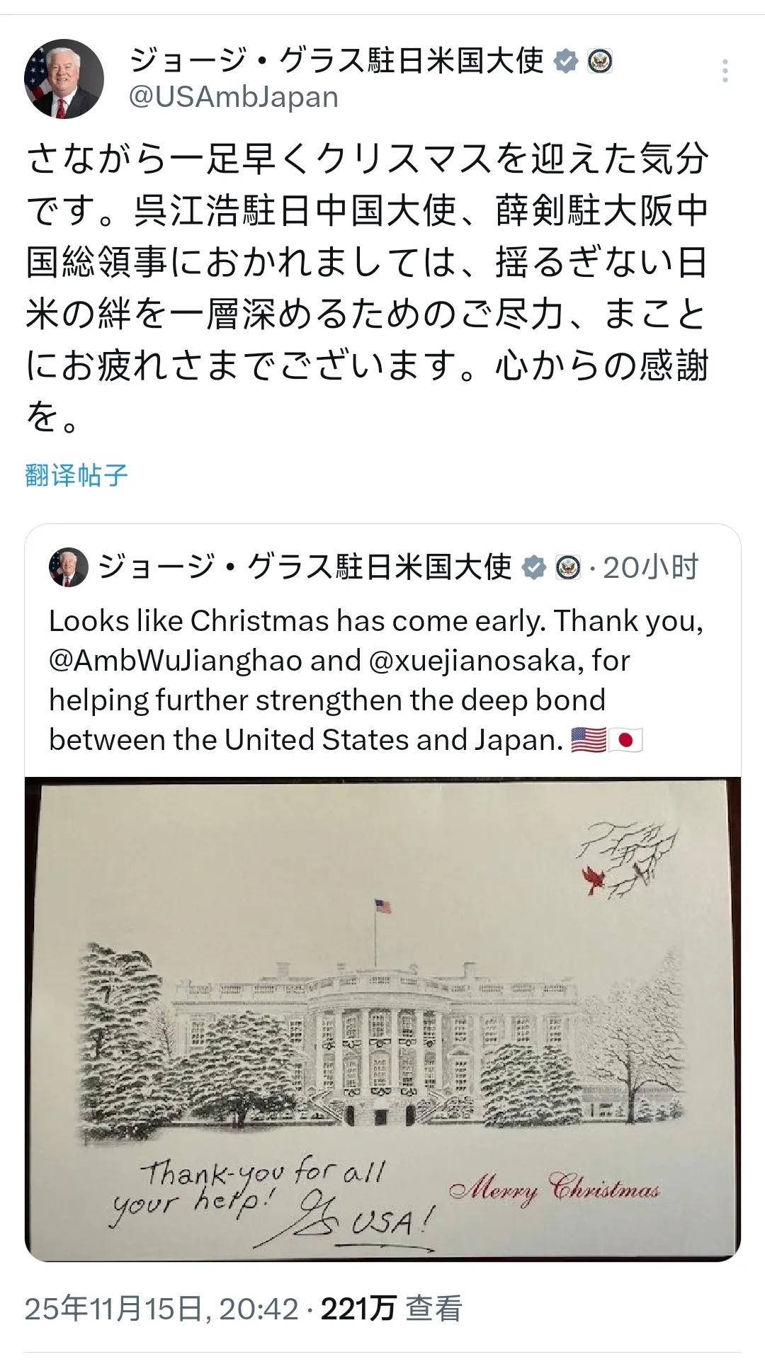 万万没想到! 美国大使这波操作太离谱! 家人们谁懂啊!刚刷到美国驻日大使格拉斯的发文,直接看懵了!11月15号晚上,他特意用中英文发动态,说“圣诞节提前到了”,还扯着嗓子“感谢”中国驻日大使和驻大阪总领事,说人家帮着“深化美日友谊”。 这话说得比掺了冰的柠檬水还酸!最近中日关系明明有点小摩擦,正常人都想着劝和,他倒好,躲在一边偷着乐,把这事儿当“圣诞礼物”似的,那点心思谁看不穿?不就是想搅乱这摊水,好让美国在背后捡便宜嘛! 更离谱的是,连特朗普都知道闭着嘴不添乱,他倒活跃得像刚上了发条,一会儿煽风一会儿点火,就怕事儿闹得不够大。这哪是什么“感谢”?分明是揣着坏心思的挑拨,一边想让中日闹矛盾,一边还想给中国扣帽子! 好歹是大国外交官,就算不指望有多大格局,至少得有点体面吧?结果他眼里就只有美国那点利益,为了达目的连脸都不顾了。说真的,这模样哪像外交官,倒像个盼着出事的“看热闹不嫌事大”的主儿,把大国的脸都丢光了!你们觉得这操作够不够离谱?