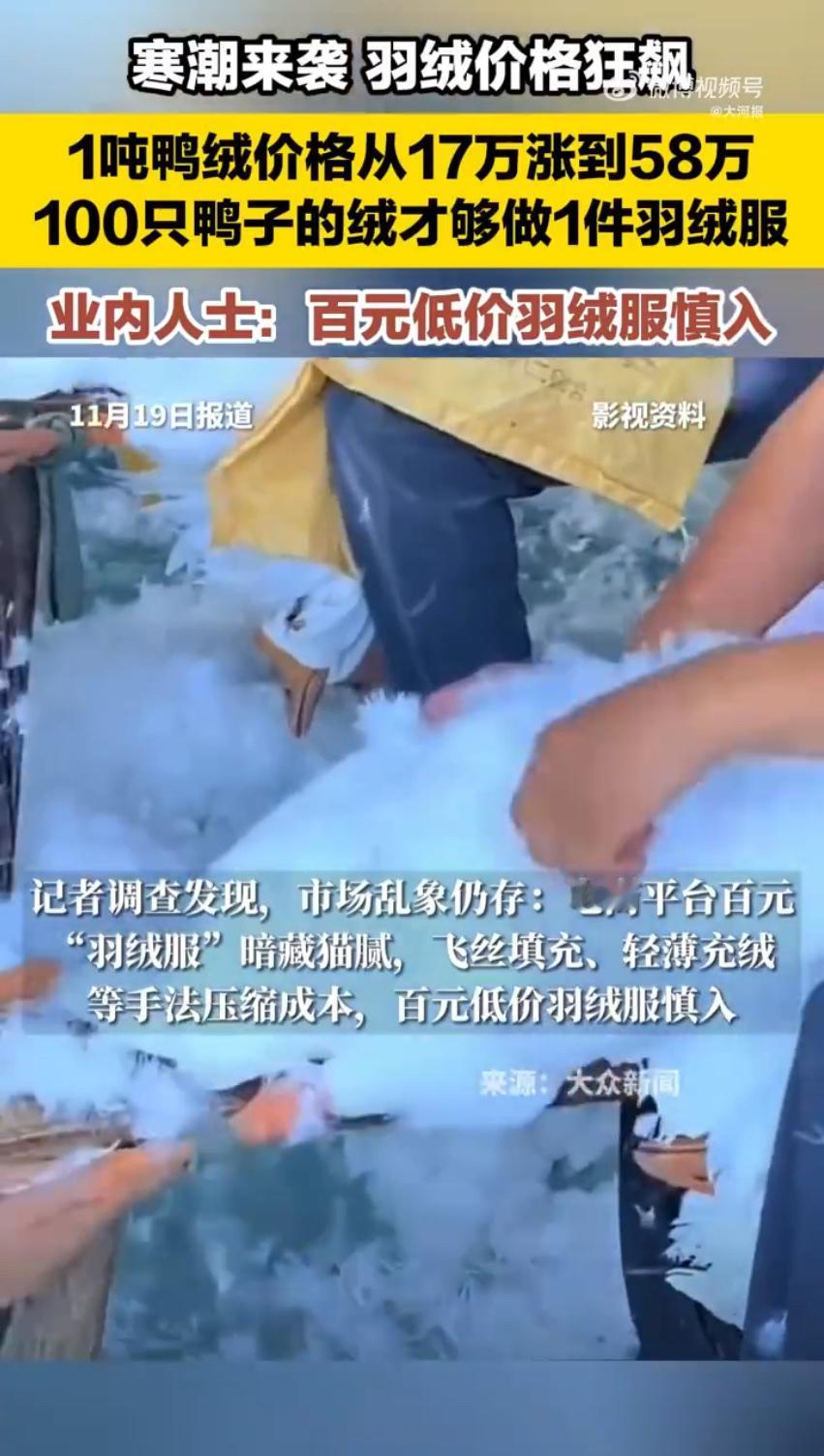 最近大家逛商场或者刷购物软件,肯定都发现羽绒服越来越贵了,甚至有消息说正规厂家的羽绒服出厂价都快逼近千元了,这让不少人直呼“冬天的温暖也太贵了”。其实这背后不是商家故意抬价,而是一连串成本上涨的连锁反应,最核心的原因就是羽绒原料价格飙得太厉害。 以前一吨90%含量的白鸭绒也就十几万元,现在直接涨到了五十多万元,翻了好几倍,鹅绒更是夸张,一吨价格都快突破百万元了。可能有人没概念,一件普通的成人短款羽绒服,差不多得用一百只鸭子的绒才能填充出来,原料成本一下子就上去了。为啥羽绒会这么贵呢?主要是鸭子、鹅的出栏量少了,之前猪肉价格波动影响了养殖户的积极性,大家觉得养鸭养鹅不赚钱,就纷纷减产,连带着鸭毛鹅毛的供应量也大幅减少。再加上环保政策收紧和零星的疫病影响,优质羽绒的产能就更紧张了,原料市场从“货等人”变成了“人等货”,不少厂家拿着钱都难抢到足够的货。 除了原料短缺,新国标的实施也让成本降不下来。现在羽绒服得按“绒子含量”来标注,不能再用以前的“含绒量”,这就意味着厂家必须用纯度更高的羽绒,那些掺杂了绒丝、飞丝的废料没法再用了,只能采购更好的原料,自然也推高了成本。而且现在大家对羽绒服的需求还在涨,不光冬天要穿,轻薄款、羽绒夏凉被这些新品类也很受欢迎,加上出口量也在增加,供需失衡让价格更是下不来。 成本一路涨,最终还是会传到消费者身上。正规厂家的出厂价都快到千元了,到了商场或者电商平台,售价自然会更高,不少品牌短款羽绒服都卖到了两三千元。这时候市场上就出现了不少低价猫腻,有些直播间里一百多、两百多元的“90%鸭绒羽绒服”,其实根本不是真羽绒,要么是用化纤棉填充,要么是用有害化学物质清洗的回收绒,还有的用飞丝冒充羽绒,不仅保暖性差,水洗后还会板结跑绒,甚至可能有刺鼻异味。 业内人士都说,抛开品牌溢价和促销活动,三百元以下很难买到真正合格的羽绒服。毕竟一件充绒量150克的90%白鸭绒羽绒服,光羽绒原料成本就几十元,再加上面料、人工、辅料等费用,合理售价肯定不会太低。现在消费者也挺两难,买品牌款觉得太贵,买低价款又怕踩坑,只能靠仔细看水洗标上的“绒子含量”、按压是否快速回弹这些小技巧来避坑。