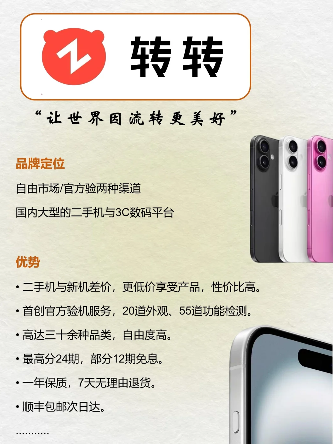 ❤️纠结过转转和咸鱼,最后猪猪还是选了转转。更认平台直售,不太信第三方担保。 1️⃣咸鱼个人卖家价虽低,但是怕验机时扯皮砍价太麻烦。 2️⃣转转明码标价、官方质检,买着放心,到手价也和平台标的分毫不差。 比如猪猪所购的iPhone15,签收时,因为怕有问题,因此当着快递员面验机的,手机电池有95%,屏幕无划痕,99新确实名副其实。 - 🌈平台每部手机都经几十道质检,确认原装无拆修才上架,连充电口螺丝都检查细致,比自己判断靠谱,售后贴心,有30天质保,出现问题还能免费维修。 - 🌸买之前在转转首页搜转转一夏,可以领取大额券,不仅可以消费手机,还能消费平板及笔记本等,大家都在转转入手了哪些东东?