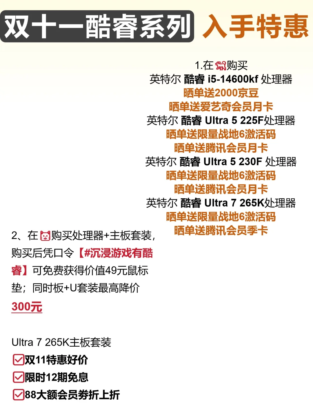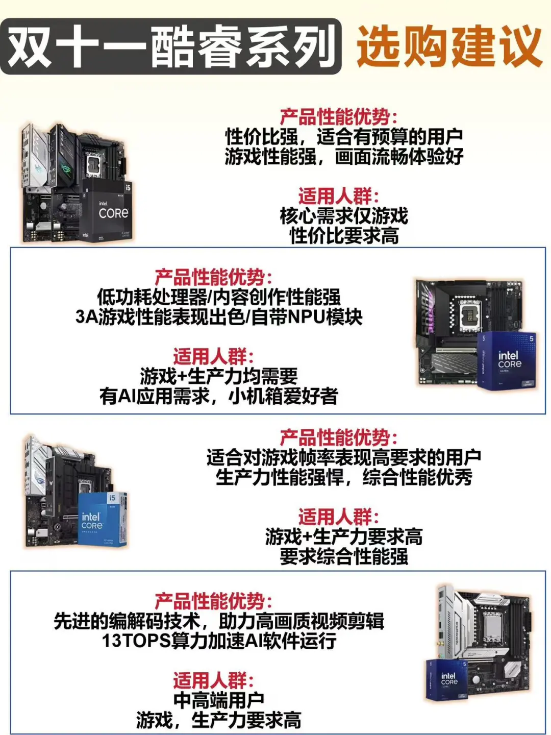 💗hello呀,大家好,我是你们的欣欣子[飞吻R] 🌈今天给大家带来的是intel酷睿的选购指南[赞R] 🌸喜欢的宝子可以快快收藏码住哦[哇R] 💻酷睿不同的款式、适合不同的人群 1.酷睿 i5 14490F的性价比强,游戏性能强,画面流畅体验好, 适合有预算的用户 2.酷睿 Ultra 5 225F可以低功耗处理器,内容创作性能强,而且 3A游戏性能表现出色,自带NPU模块,适合游戏+生产力均需要,有Al应用需求的小机箱爱好者 3.酷睿 i5 14600k的生产力性能强悍,综合性能优秀,适合对游戏帧率表现高要求的用户 4.酷睿 Ultra 7 265k有着先进的编解码技术,助力高画质视频剪辑,13TOPS算力加速AI软件运行,比较适合咱们中高端用户 💻而且Ultra 7 265K主板套装可享受 1️⃣双11特惠好价 2️⃣限时12期免息 3️⃣88大额会员劵折上折