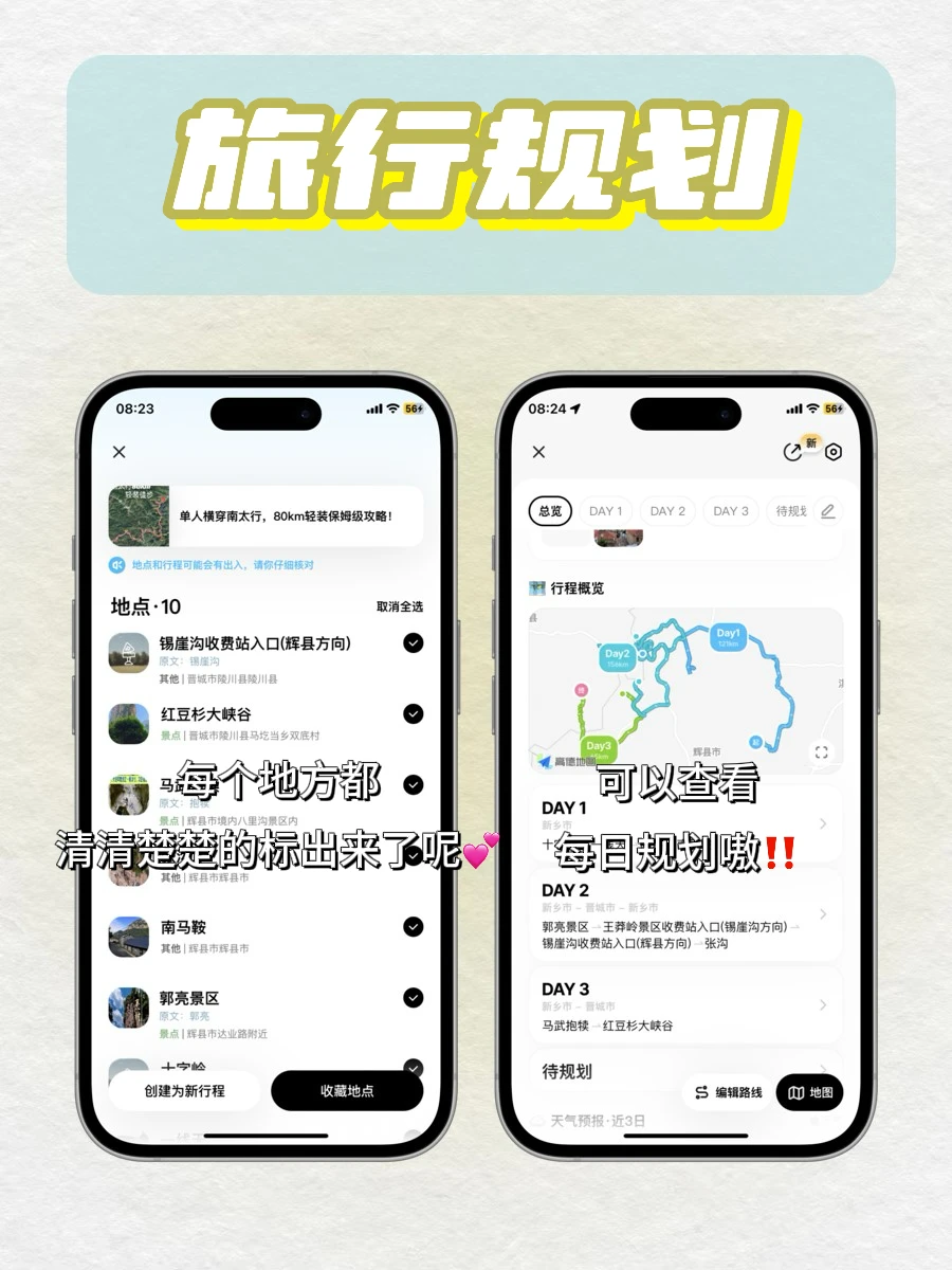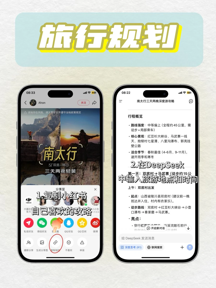 🌟宝子们~你们好呀[飞吻R]\n被办公室吸干灵气的人类 请收下这份修仙指南\n输入\"轻徒步+古村摄影+不费腿\" 复制到圆周旅迹🔥\n三秒炸出这份秘境攻略👇\n\t\n⏰Day1\n07:00 穿越太行一号公路彩虹隧道\n12:00 王莽岭云端餐厅吞刀削面\n16:00 昆山挂壁公路拍悬崖光瀑\n20:00 郭亮村观星台承包银河\n\t\n⏰Day2\n09:00 抱犊沟挑战720°崖边咖啡\n15:00 锡崖沟瀑布下泡野温泉\n19:00 尝鲜太行三宝宴(地锅鸡+野韭菜炒土鸡蛋+酸枣汁)\n💥圆周旅迹➕DeepSeek南太行黑科技\n✅一键避开驴友团:自动错峰规划峡谷穿越时间\n✅崖壁安全雷达:实时推送落石路段预警\n✅古风滤镜库:自动生成《国家地理》同款水墨大片\n现在连「悬崖山羊出没点」都标记在攻略里‼️\n跟着路线找到百年柿树秘境\n评论区解锁八里沟隐藏瀑布路线\n