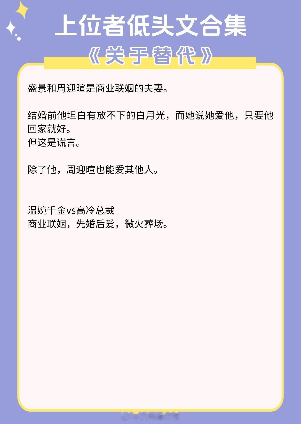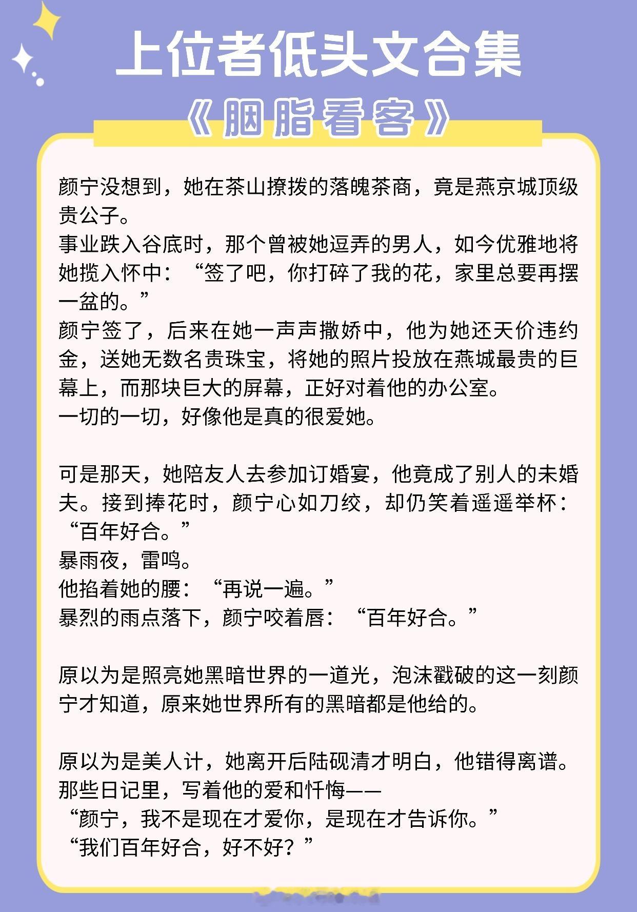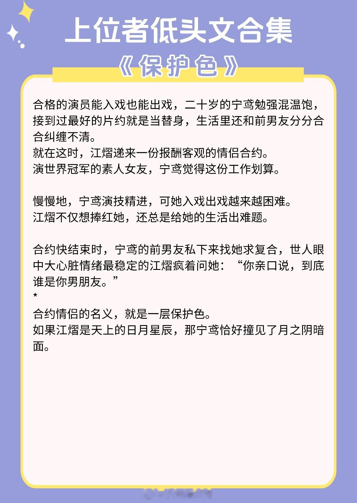 【上位者低头文】我不是现在才爱你,是现在才告诉你。《戒断后遗症》作者:千载之下《胭脂看客》作者:孟宋《保护色》作者:锦换《关于替代》作者:取名狂魔小洋《三尺春》作者:长青长白《二嫁天子》 作者:石上清泉《国王向她俯首》作者:白日梦羊《上船》作者:唯酒《鲜红淡绿》作者:勖力