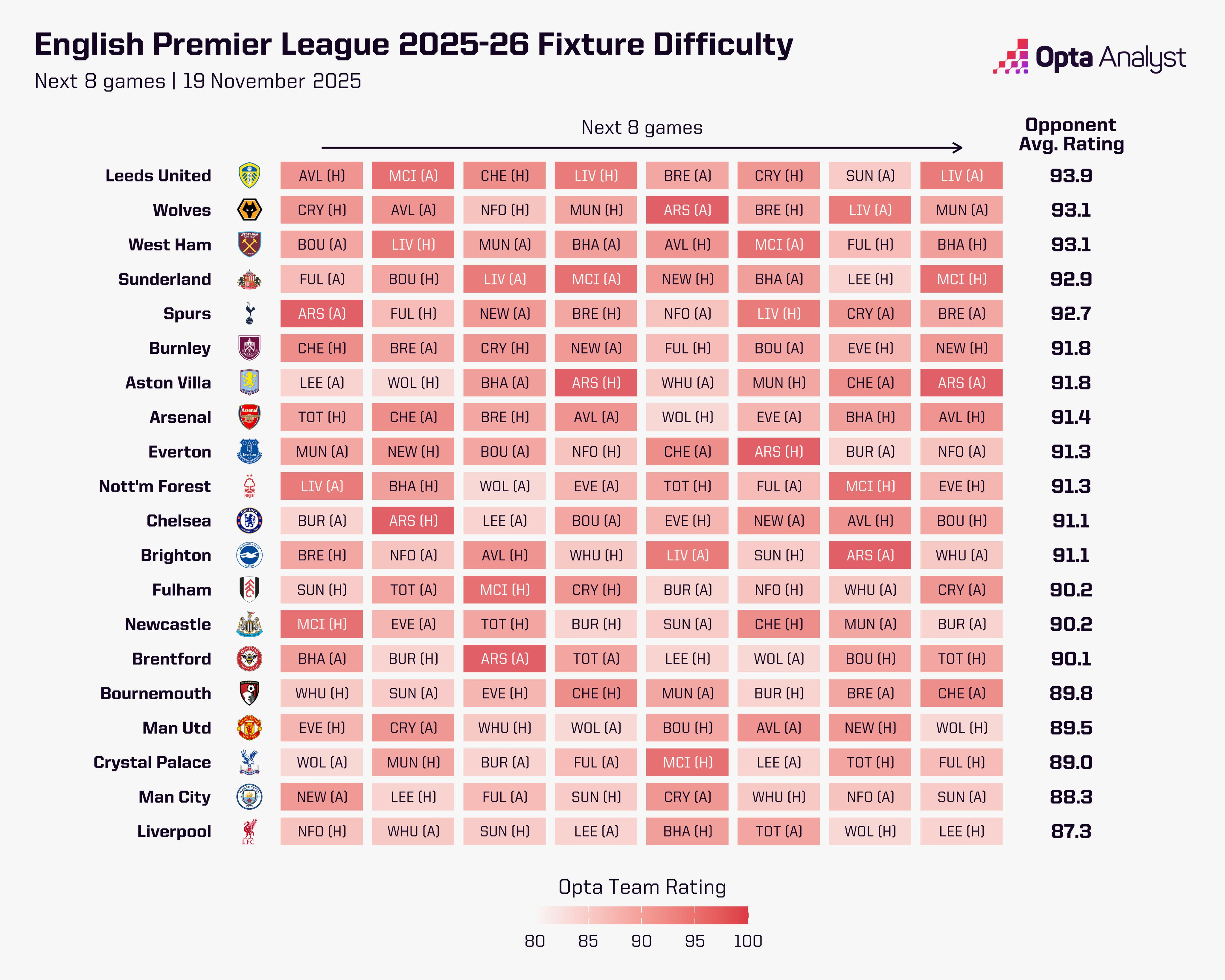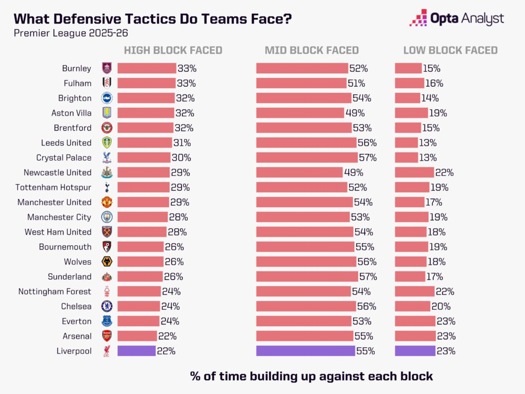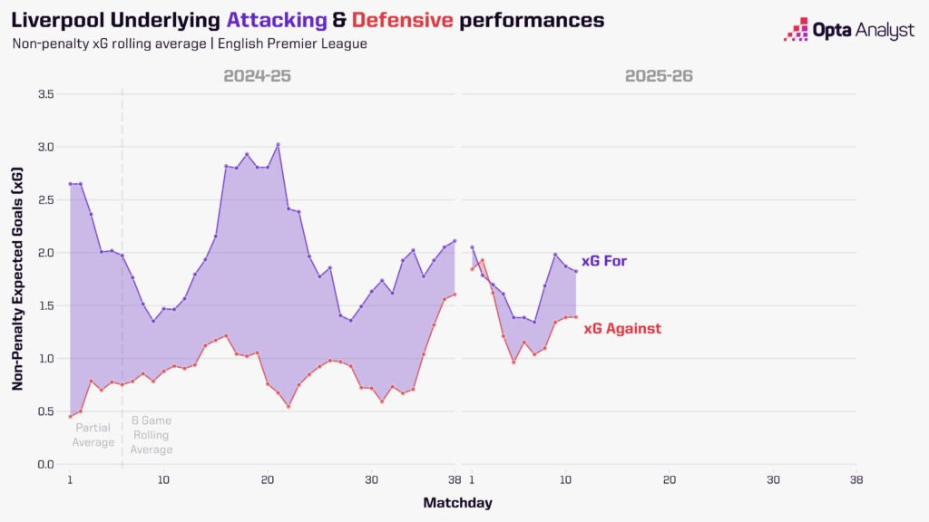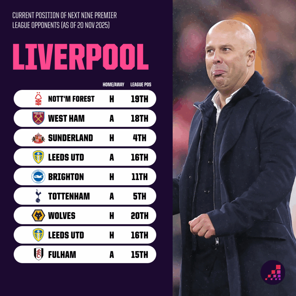 救赎赛季,此刻正当其时2025-26赛季英超11轮战罢已输掉5场,卫冕冠军利物浦早已脱离争冠第一集团。未来几周,他们能否重回正轨?回溯至仿佛遥远的2025年8月,彼时竞争对手对利物浦卫冕英超的恐惧显而易见。2024-25赛季,红军轻松夺冠;随后的夏季转会窗,他们一反常态掀起引援狂潮,签下多位欧洲顶尖天才,誓要巩固在英格兰足坛的霸主地位。而本赛季的开局,几乎堪称完美。9月20日默西塞德德比击败埃弗顿后,利物浦以五战全胜积15分的战绩登顶英超。然而两个月后,他们在近六场比赛输掉五场,目前以18分位列积分榜第八。铺天盖地的尖锐批评接踵而至,这或许源于他们状态下滑的惊人程度。利物浦前五场胜利虽不算统治级,但说有人能预见如今的颓势,更多是出于奢望而非理性预判。这并非说赛季前就毫无隐忧。若认为7月初迪奥戈·若塔的不幸离世不会对教练组、上赛季并肩作战的队友,以及初来乍到、却被悲伤氛围笼罩的新援产生深远影响,那未免太过无知。周二,在苏格兰戏剧性击败丹麦、成功晋级明年夏天世界杯后,罗伯发自肺腑的话语,足以说明队友中,至少有一人在赛前难以保持专注——而这还是在国家队赛事中。试想,在俱乐部层面,与若塔共事五年的罗伯所承受的悲痛与失落该有多深。每场比赛都在无情提醒着他,昔日战友已不在身旁,利物浦的许多球员想必也有同样的感受。在胜负只在毫厘之间的精英体育领域,如此沉重的情感打击所带来的影响,绝不能被忽视。国际比赛日前1-3不敌曼城是一场不敌劲敌的惨败,但那些关键的毫厘之差再次凸显。正如英超关键赛事判罚小组所言,若范戴克上半场那记本可将比分扳为1-1的进球有效,比赛走势或许会截然不同。瓜迪奥拉的球队配得上胜利,利物浦在伊蒂哈德球场的表现确实不佳,但值得铭记的是,一周多前红军刚稳稳击败状态正佳的维拉,五天前又在欧冠赛场1-0力克皇家马德里——那场胜利对西甲豪门而言已算侥幸。不过放到整个赛季的大背景下,这场失利让外界对卫冕冠军的实力产生了更多质疑,这也不难理解。公平地说,他们的联赛开局赛程确实颇具挑战性。11个对手中,目前仅有伯恩利一支球队处于积分榜倒数六名,而唯一在主场对阵的下半区球队是埃弗顿。事实上,英超积分榜前十的其他九支球队中,利物浦已经遭遇了七支。这并非为他们的表现找借口:在现代足球语境下,前11轮输掉5场绝对算得上“危机”——尤其是考虑到他们上赛季整个赛季仅输4场,且其中两场是在夺冠后状态明显松懈的情况下。但正如我们本周早些时候分析的那样,从纸面实力来看,利物浦接下来的赛程相对轻松,周六将主场迎战排名第19位的诺丁汉森林。事实上,在接下来的五场比赛中,他们唯一的上半区对手是12月3日主场对阵的升班马桑德兰。斯洛特有诸多问题亟待解决。此前击败阿斯顿维拉和皇家马德里的比赛中,他启用了上赛季心仪的迈巴赫,球队表现明显回升——尽管这或许仍是他手中最强的中场组合,但五场联赛失利中,有四场正是这套阵容首发。对阵曼城的比赛或许印证了外界普遍认为的“照搬上赛季阵容即可”的解决方案,并非人们想象中那般稳妥。我们近期已分析过他们在应对长传方面的短板,此处不再赘述。与此相关的是,利物浦本赛季控球率颇高。对手似乎乐于采用长传战术,若长传无效,便放任红军控球,让他们去破解密集防守。利物浦本赛季英超场均控球率达60.7%,位居联赛第一;而面对中低位密集防守的比赛时间占比高达78%,同样是联赛最高。这或许正是引进弗洛里安·维尔茨的初衷。斯洛特曾被指责对这位德国天才缺乏使用规划,但显然,签下他是为了帮助利物浦破解上赛季末愈发棘手的密集防守——只是目前效果尚未显现。1亿英镑的转会费(潜在最高1.16亿英镑)背后伴随着巨大压力,而维尔茨至今尚未在英超取得进球或助攻,这无疑让情况雪上加霜。他在欧冠赛场表现出色,但尚未将状态延续至英格兰顶级联赛。维尔茨在欧冠赛场每90分钟能创造4.2次运动战机会,而在英超仅为1.7次;欧冠每90分钟创造1.3次绝佳机会,英超仅0.1次;欧冠预期助攻数场均0.55,英超则降至0.15。这位22岁的球员显然还有更大潜力可挖,周一他在德国对阵斯洛伐克的比赛中送出两次助攻,希望这能为他带来信心,在未来几周的英超赛场实现突破。此外,夏季另一笔亿元引援亚历山大·伊萨克也即将伤愈复出。这位瑞典前锋是斯洛特尚未破解的又一难题,但一旦找回状态,他的实力毋庸置疑。利物浦本赛季英超非点球射门转化率仅为15.3%,而伊萨克上赛季的这一数据为26.4%——只要能接近这一水准,就至少能缓解球队的进攻困境。不过,这位前纽卡球员要挤进首发阵容并非易事,因为埃基蒂克是本赛季安菲尔德为数不多的亮点。而斯洛特表示,他可以让两人搭档出战,就像在5-1大胜法兰克福的比赛中那样。国际比赛日期间,埃基蒂克在法国对阵乌克兰的比赛中攻入个人国家队处子球,与基利安·姆巴佩的配合堪称完美,这也展现了他与另一位前锋搭档的出色能力。尽管埃基蒂克表现亮眼,但他的队友们在门前的把握能力普遍不足。上赛季利物浦英超场均进球2.3个,而本赛季11轮过后降至1.6个。英超赛场,仅有切尔西(37次)、曼城(34次)和水晶宫(34次)创造的绝佳机会数多于利物浦(33次),但红军27.3%的绝佳机会转化率仅高于维拉(20%)和利兹(
