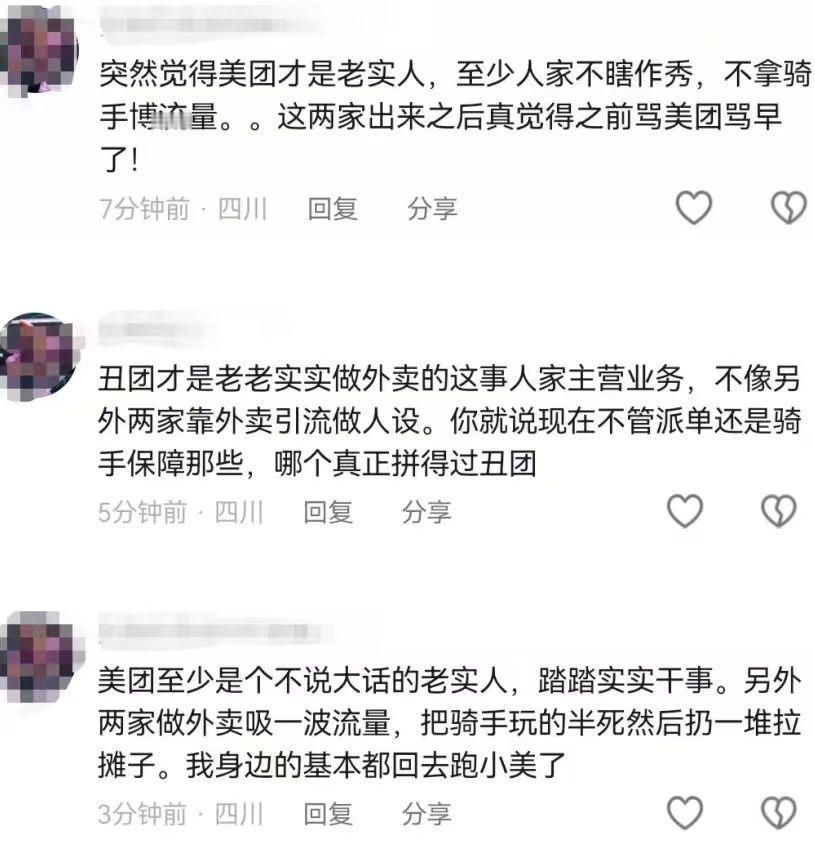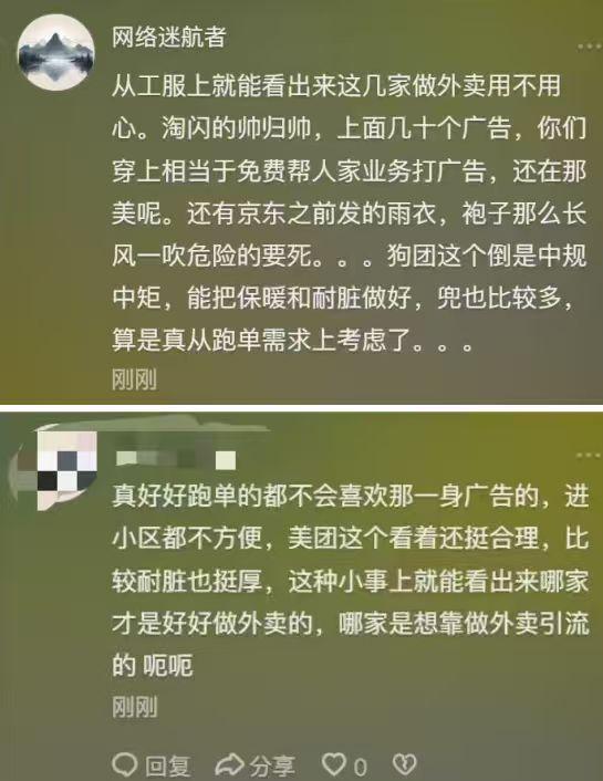 其实从骑手工装这个事,就能看出谁在认真做外卖。今天在小区看到个穿着淘宝新工装的老哥,确实帅到我了,版型端正炫酷,赛车范十足。但这位老哥却说,好看是好看,但满身印着七八个logo,穿起来像“移动广告位”,实用性不够。 还有前两天看到的京东雨衣更离谱,下摆长得能当披风。不少骑手都吐槽,"设计师懂时尚,但不懂骑手。这大袍子被风一鼓,挂到树枝都是轻的,要是卷进车轮里,那才叫危险。" 反观团子最近的新工服,虽然还是不起眼,但胜在厚实暖和还耐脏,尤其是兜多容量大,手机、充电宝、纸巾都能分开装。在北方很多低温地区,骑手更看重的是保暖和实用,毕竟零下一二十度送外卖,保命比耍帅重要多了。 这些细节看下来,突然觉得美团才是实实在在的做事风格。除了新工装,还闷声把社保覆盖到全国骑手,连众包都能领养老保险补贴。难怪现在骑手圈流传着新说法:"年少不知美团好,错把补贴当成宝。" 最近也经常在外卖柜前听见骑手交流。有淘宝闪购骑手提到,现在配送时间被压到最短25分钟,如果商家出餐慢一点,留给骑手的就只有十几分钟,“根本没法多挂单,要么闯红灯抢时间,要么拿四块钱当专人直送。” 相比之下,美团虽然经常被骂,但目前来看,反倒是几家平台中单价更稳、时间设置更合理的那一个。难怪现在越来越多骑手回流美团了。 现在回头看,团子真要感谢另外两家的衬托。不是他们这么一折腾,大家还真发现不了,这个被骂惯了的"老实人",用最朴实的方式诠释了什么叫认真做外卖。毕竟外卖终究要靠骑手一单一单跑出来,而能让他们穿得暖、跑得安心的平台,才配得上他们日复一日的奔赴。当然也要感谢其他两个平台的竞争,美团也算听劝肯改变了。