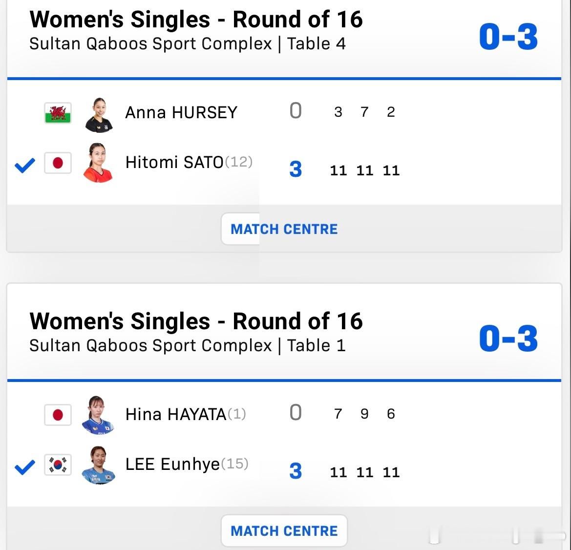 女单1/8决赛:🇰🇷李恩惠3比0早田希娜🇯🇵🇰🇷朱芊曦3比2袁嘉楠🇫🇷下一轮 李恩惠🆚朱芊曦🇯🇵横井咲樱3比0长崎美柚🇯🇵🇯🇵佐藤瞳3比0安娜·赫尔希🏴