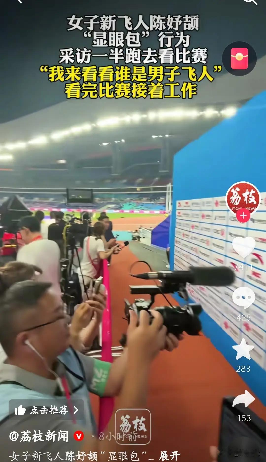 运动界的“显眼包”非她莫属!新科女子飞人陈妤颉,采访到一半突然“撂挑子”,听见男子百米赛要开始,直接丢下话筒窜出去:“我去看看谁是男子飞人!” 现在记者采访的水平也有待提高,问的全是些无脑问题。 尖子生待遇还是不一样[呲牙]。 所以说这个采访时间的安排是有瑕疵的 毕竟是个孩子,率性天真可爱! 谁说女子不如男?看看比我快多少? 我读高中只有学霸才能谈恋爱。所以规矩可以为强者让路[呲牙]。
