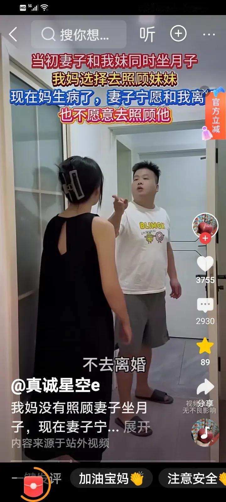 两人的拉扯引来邻居围观,妻子的头发被扯得乱七八糟,哭着喊“你松开我,我再也不想忍了” 视频里妻子翻出三年前的朋友圈——那时她剖腹产刚出院,躺在沙发上啃冷面包,婆婆却在小姑子家晒鲫鱼汤,配文“我的小棉袄最金贵”。她摸着腰说,当年自己扶着墙去厕所,腰上的刀口渗血,婆婆连个电话都没打 某婚恋网站2024年调查显示,37%的夫妻矛盾源于“月子委屈”,其中82%的女性会把这份情绪记超过3年。民法典也明确:儿媳没有法定赡养义务,照顾公婆是基于夫妻感情的自愿行为 为什么妻子宁肯离婚也不愿照顾婆婆? ① 月子里的伤害没愈合——婆婆的偏心不是“小事”,是妻子在最需要帮助时被“放弃”的证明,碰一次疼一次; ② 丈夫的态度寒了心——丈夫没帮妻子说话,反而用“离婚”施压,等于告诉妻子“我妈比你重要”; ③ 需求没被看见——妻子要的不是“不照顾”,是“你懂我的苦”,可丈夫只盯着“照顾婆婆”的结果 很多丈夫都犯过这样的错:把“妻子的爱”当成“义务”,忘了这份爱需要“回应”。妻子愿意照顾婆婆,是因为爱丈夫;可如果丈夫把这份爱当成“应该”,甚至用离婚威胁,那爱就会慢慢消失。就像邻居说的:“自己的妈自己管,逼媳妇算什么本事” 有网友评论:“就问一句:自己的亲妈自己不照顾,为什么让自己媳妇来照顾呢!还这么理直气壮。自己都不想照顾。婆婆又没把儿媳妇一把屎一把尿的给养大”。这话虽直白,却点破了最核心的理——赡养父母是子女的责任,不是儿媳的“任务” 我觉得,婚姻里最该学的是“共情”。丈夫要是能蹲下来,握住妻子的手说“当年我没护着你,是我错了”,再商量“咱们轮流去医院,我每天晚上守夜”,妻子说不定会软下心。毕竟,女人要的从来不是“赢”,是“被放在心上” 这事你怎么看?如果你是妻子,你会选妥协还是离婚?