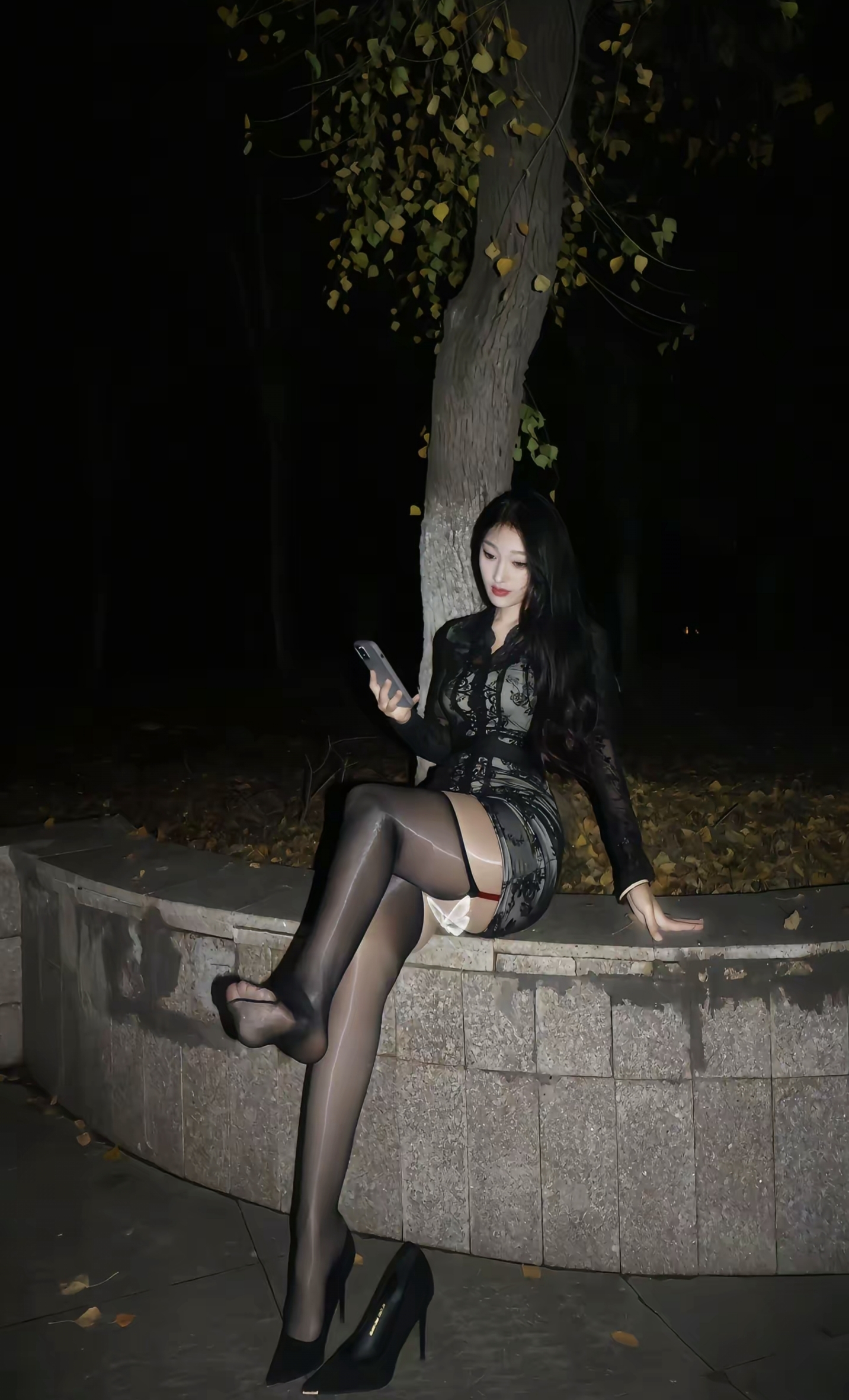 夜色中的穿搭摄影美学 夜幕下,模特的蕾丝印花裙、光泽丝袜与尖头高跟,在暗环境中尽显质感。摄影以树木石栏为衬,借光影突出穿搭线条与气质,将时尚穿搭与夜间景致融合,用镜头定格出兼具优雅与氛围感的视觉瞬间,诠释了穿搭在摄影中作为艺术语言的独特表达。黑丝高跟鞋穿搭 街头摄影穿搭