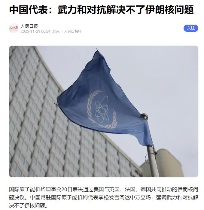 中国代表:武力和对抗解决不了伊朗核问题。 刚过去的11月20日,美英法德在国际原子能机构推完涉伊决议,伊朗就火速宣告9月才签署的开罗协议失效,两个月的合作火苗瞬间被浇灭。6月以美空袭核设施的旧怨未消,制裁加码的新冲突又接踵而至,越对抗越失控的困局已摆在眼前,这恰恰印证了中方的判断,唯有放下对抗、回归协商,才能不让中东局势滑向更危险的境地。 解决伊核问题的正道其实特别明白,中国一直强调的“别搞武力对抗,靠对话协商”不是空话,这是实实在在能走通的路。毕竟核问题牵一发而动全身,真闹到不可收拾的地步,没有哪个国家能独善其身。 现在最让人担心的,是对抗已经引发了连锁风险。美国和以色列今年6月动了伊朗的核设施后,不只是两国矛盾升级,整个中东的安全焦虑都被拉高了。 有分析指出,沙特、土耳其这些国家本来就有核能开发基础,现在看到靠强硬手段解决不了问题,都在琢磨强化自身安全保障,这要是引发“连环核扩散”,全球防核扩散的规矩就彻底乱了。 更麻烦的是,这种对抗还催生了代理人战争的风险,伊朗在地区内的相关武装组织各自有根基,真打起来根本没法控制,最后可能波及全球,这可不是危言耸听。 国际原子能机构的核查工作也被搅得一团糟。根据机构2024年的报告,伊朗早就停止履行之前全面协议里的不少核相关承诺,从2021年起就不执行“附加议定书”了,后来还拆了不少监视监测设备。 现在机构连伊朗的离心机产量、重水存量都没法持续跟踪,核材料会不会流入黑市、有没有安全事故风险,谁都心里没底。 本来9月份机构和伊朗在开罗谈好恢复合作,这是难得的转机,结果英法德非要启动“快速恢复制裁”,直接把这扇门又关上了,你越施压,伊朗越不配合核查,形成恶性循环,机构的监督作用等于被架空了。 为啥说武力和制裁没用?看看实际情况就知道。美国2018年退出全面协议后,层层加码制裁,可伊朗的核活动反而更激进了,浓缩铀库存和离心机数量都在增加。 国际社会花了十几年谈成的全面协议,是经过安理会核可的,本来是解决问题的最佳选择,现在被对抗情绪抛在一边,实在可惜。 中国代表傅聪早就呼吁,各方得抓住复谈机会,平衡解决彼此的合理关切,不能推倒重来另起炉灶。 这次国际原子能机构理事会投票,34个成员国里不少国家都不认同对抗路线,中国和俄罗斯等投了反对票,12个发展中国家弃权,这说明国际社会心里都有杆秤。 大家想要的是地区稳定,不是无休止的冲突。那些执着于强硬手段的国家得明白,现在的核问题早就不是“压制对方”就能解决的。 伊朗作为《不扩散核武器条约》缔约国,本来就有和平利用核能的权利,无视这个基本事实,再怎么施压都是白费功夫。 说到底,伊核问题的解决不只是中东的事,还关系到全球安全治理的规则。如果大国都把国际机构当成博弈工具,靠强权推行自己的主张,那以后任何国际争端都没法好好解决了。 真正的安全不是靠武力威慑,而是靠大家都遵守规则、互相尊重。希望各方能早点放下对抗思维,回到全面协议的框架里,通过平等谈判化解分歧。 毕竟全球防核扩散的体系经不起折腾,和平稳定才是所有国家的共同利益,这才是负责任的选择。