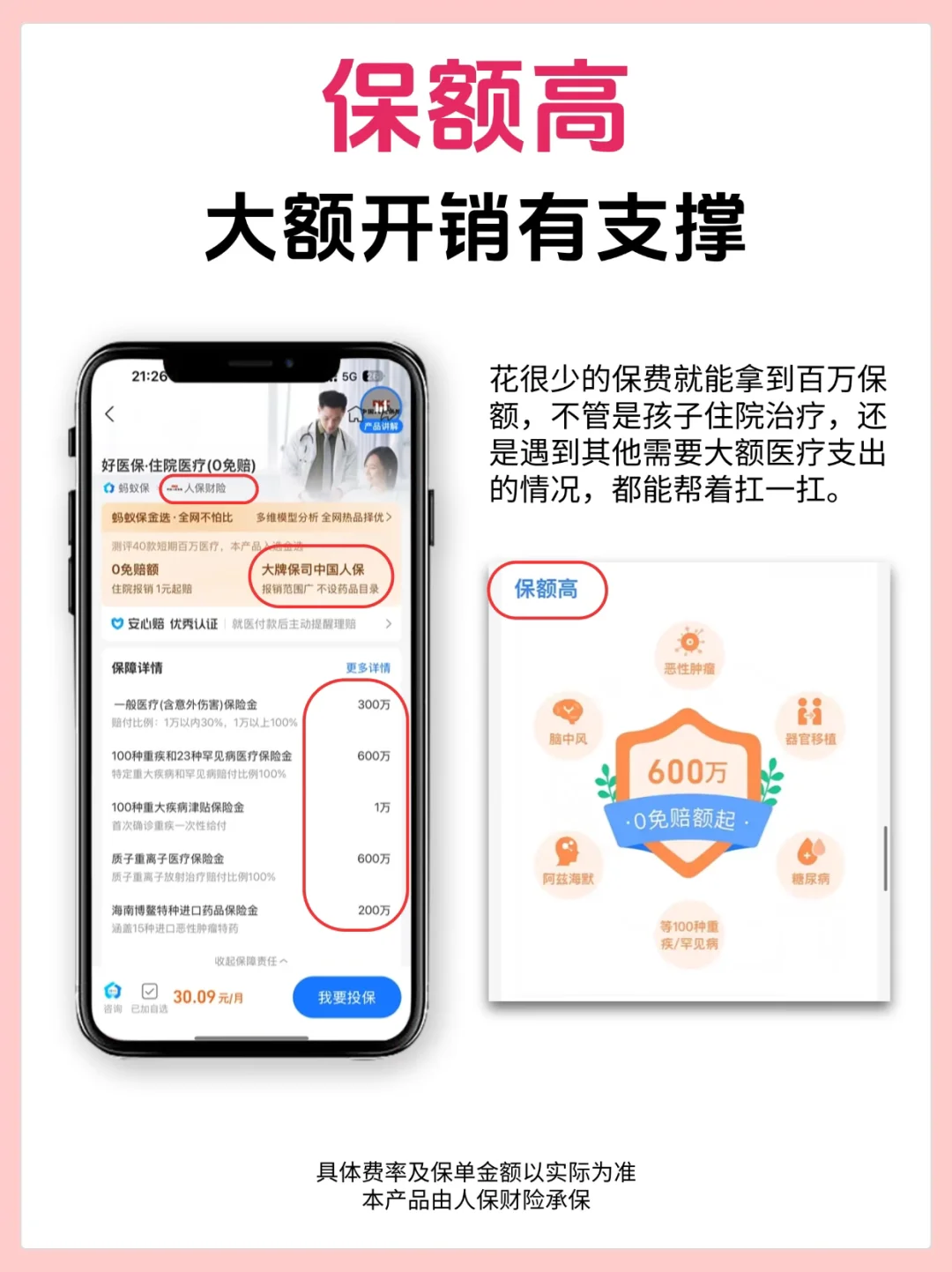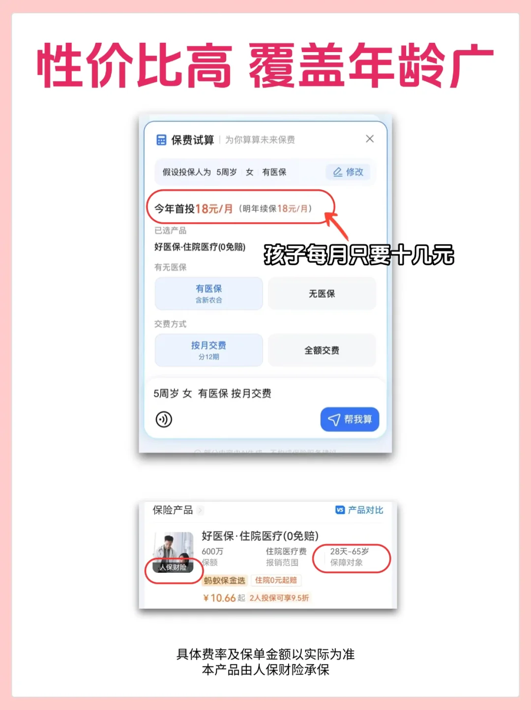 ✅ 性价比高:小朋友每月保费只要十几块,但是能换来年度累计给付限额600万的医疗保障,不管是孩子住院治疗,还是有其他大额医疗开销,都能多份支撑。