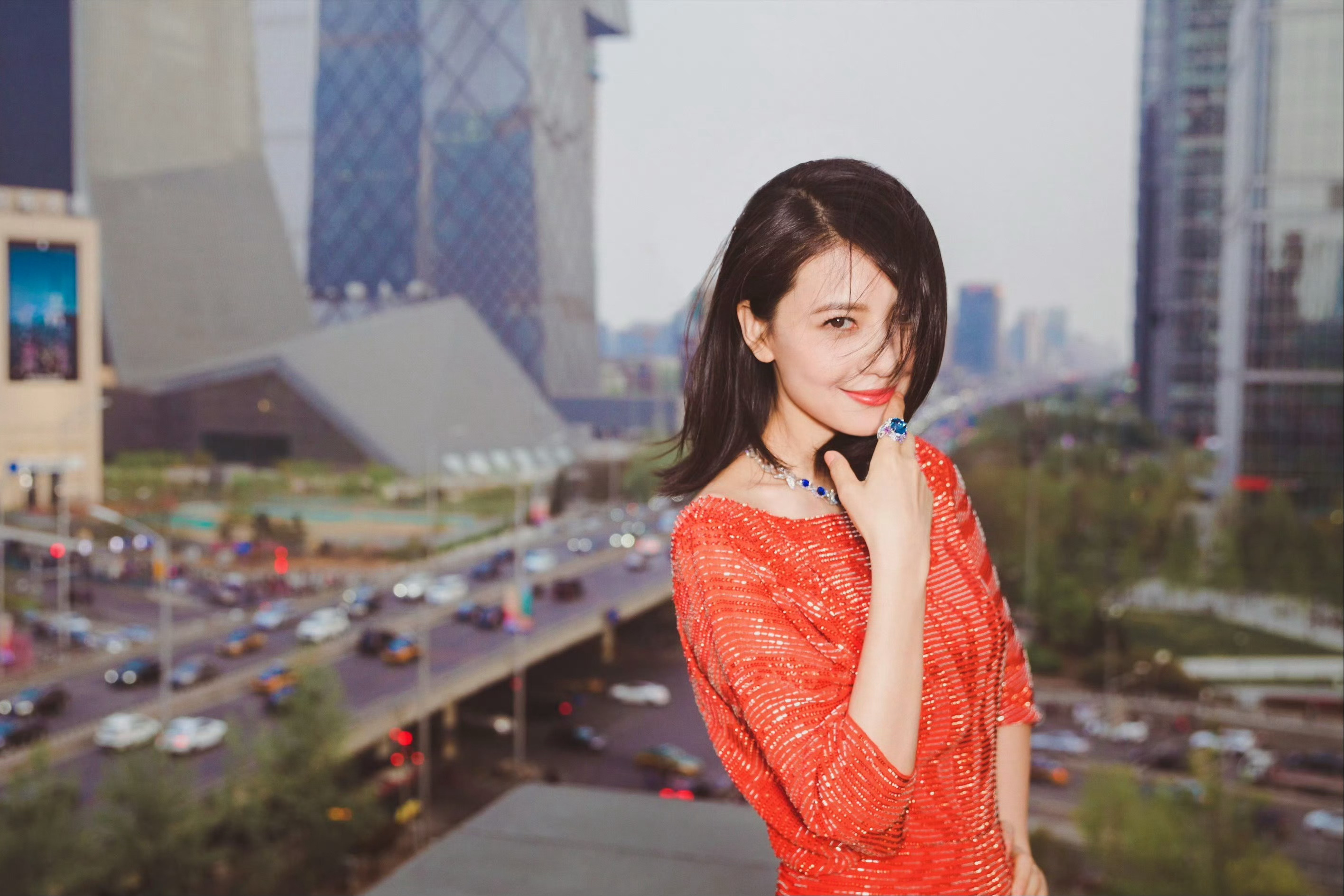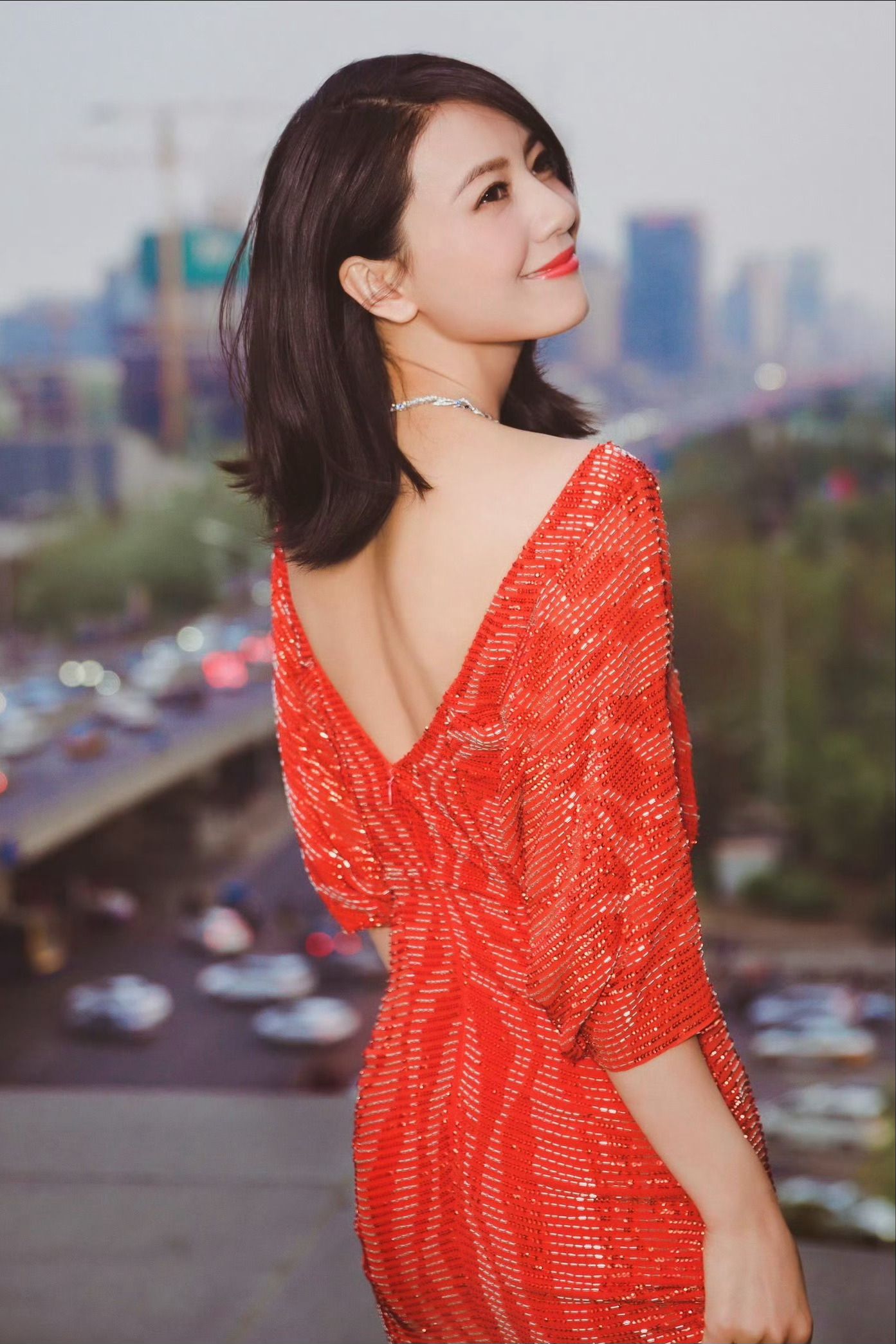 一袭红色亮片露背长裙,在城市建筑群背景下,笑容明媚,珠宝点缀更显优雅,时尚与都市