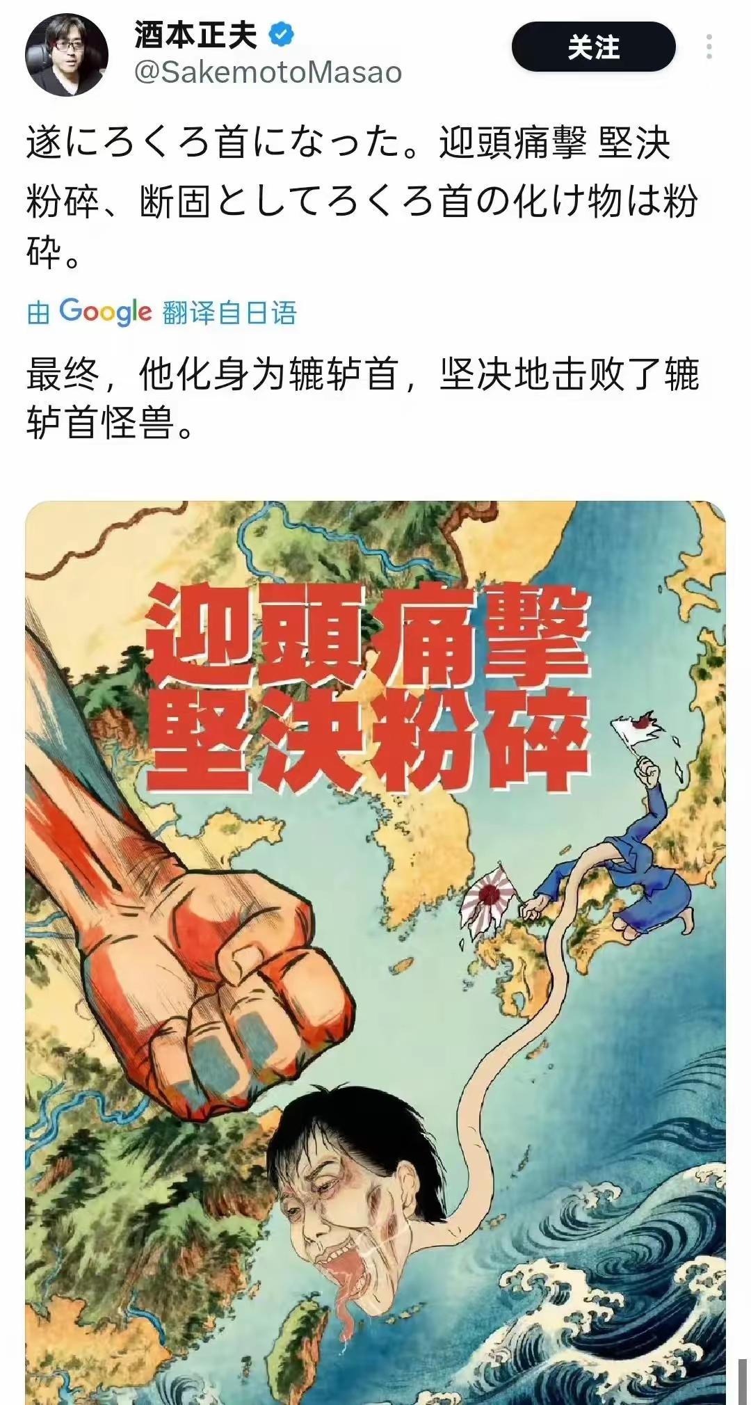 这张图是一名日本人酒本正夫制作的,其中的日文翻译为:最终还是束手无策了。迎头痛击坚决粉碎,决断的将脖子上的怪物碾碎。