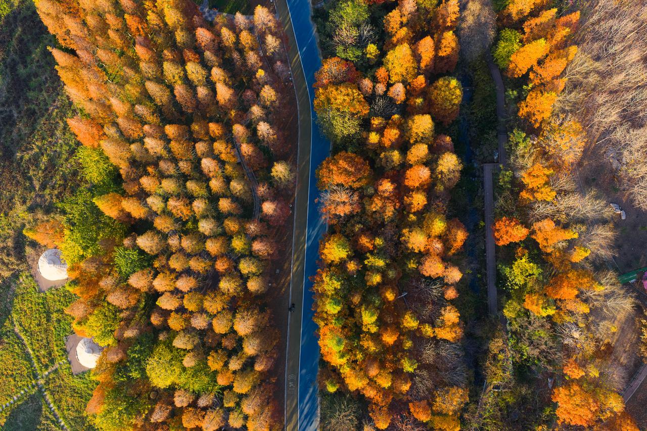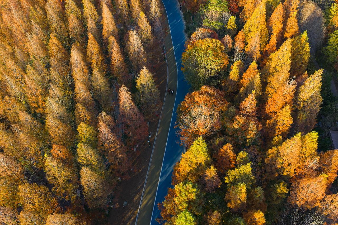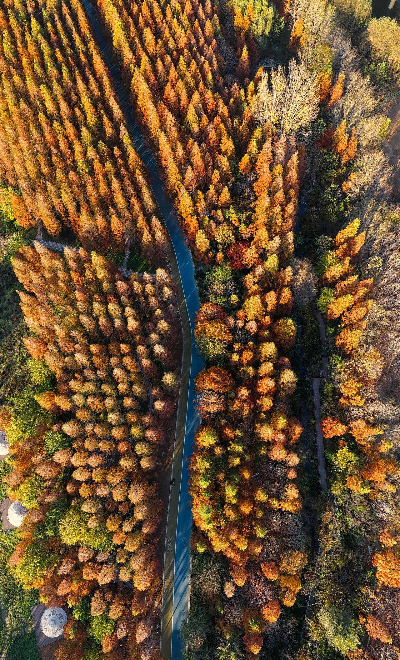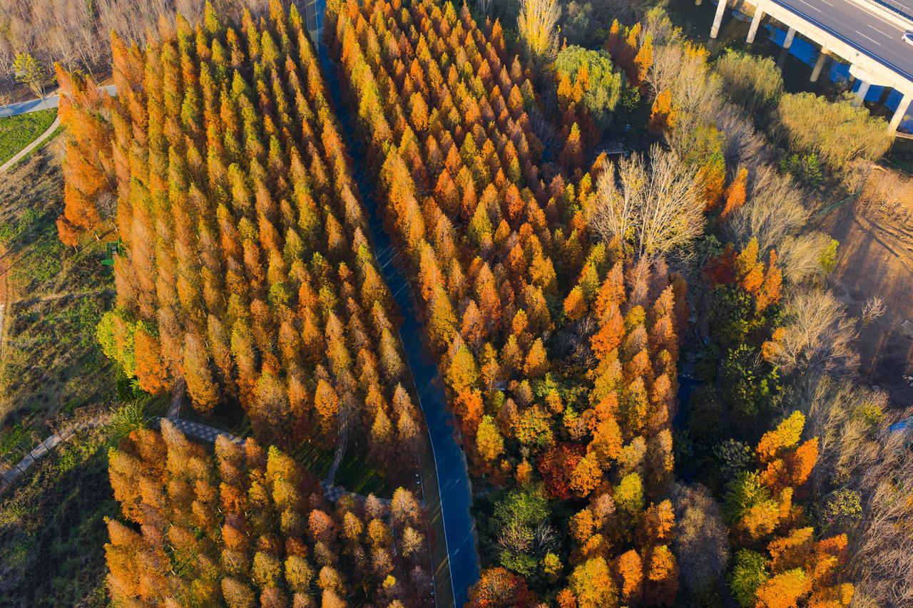 沿着水杉林间的木栈道慢慢前行,耳边不时传来鸟儿的鸣叫声,偶尔还有风吹过树叶的 “沙沙” 声,格外治愈。栈道旁偶尔会遇到几丛小野菊,白色、黄色的小花朵点缀在橙红的水杉林里,为这幅秋日画卷增添了几分灵动。