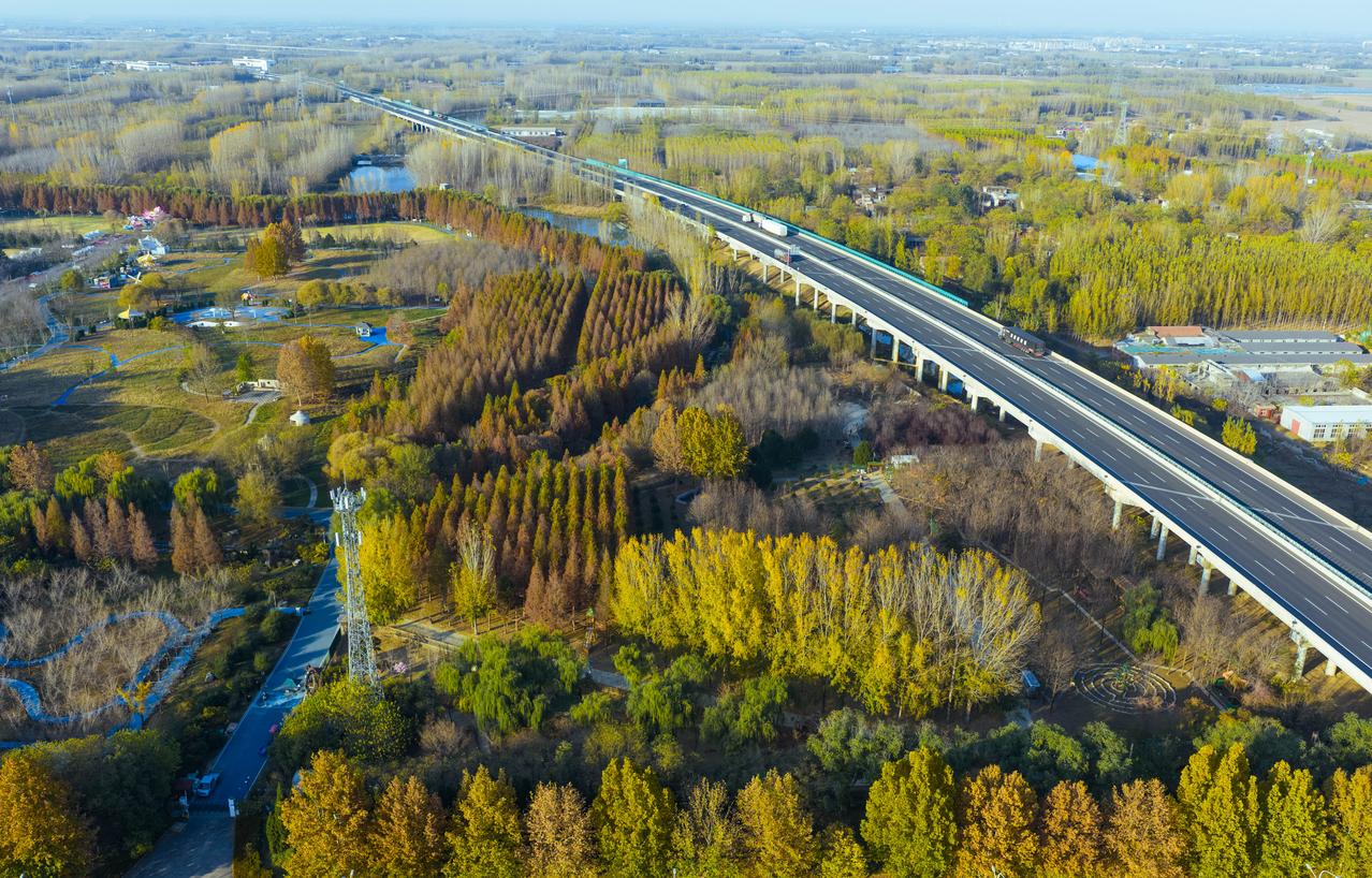 秋日的济南鲜花港。树叶早已褪去夏日的翠绿,换上了热烈的橙红与金黄。阳光透过枝叶的缝隙洒下来,在地面上形成斑驳的光影,随风轻轻晃动,仿佛无数跳动的小精灵。