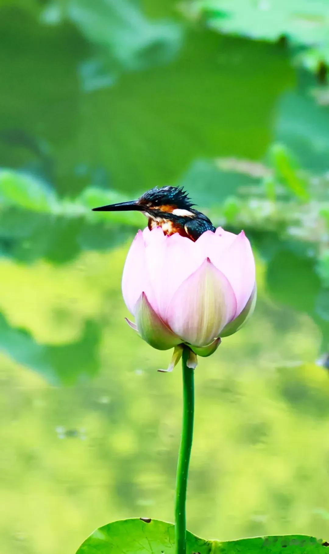 “小精灵与粉荷共舞,自然之美尽收眼底”🌸🐦荷韵仙姿 荷池见鲤戏清波