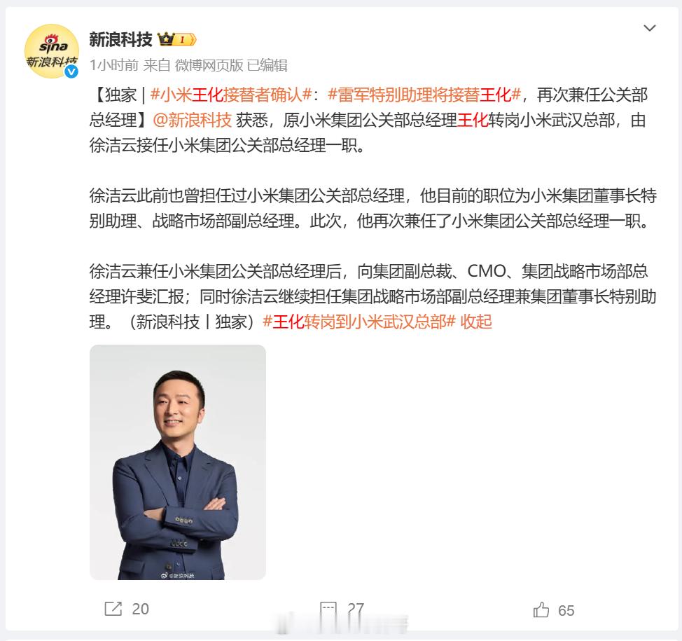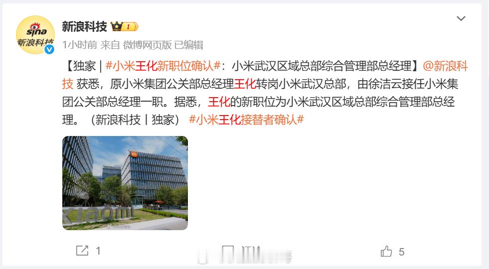 小米公关部总经理王化发博,今天到小米武汉总部正式开展工作第一天,确认了网传的转岗,新职位为小米武汉区域总部综合管理部总经理。同时他说轮岗制度的规则里面,三年就该轮岗,五年是必须轮岗。所以我轮岗的时间点是五年前就定下来了;岗位有几个选择,武汉是我选的。另外选择武汉总部的原因是因为武汉距离成都更近。小米王化接替者确认,现在由由雷军特别助理徐洁云接任,徐洁云此前也曾担任过小米集团公关部总经理,他目前的职位为小米集团董事长特别助理、战略市场部副总经理。