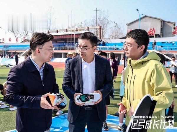 岳阳市副市长张世愚、上海六院国家骨科医学中心副主任医师邹剑、安踏儿童品牌总监初帅现场交流足弓成长计划及足弓PRO跑鞋