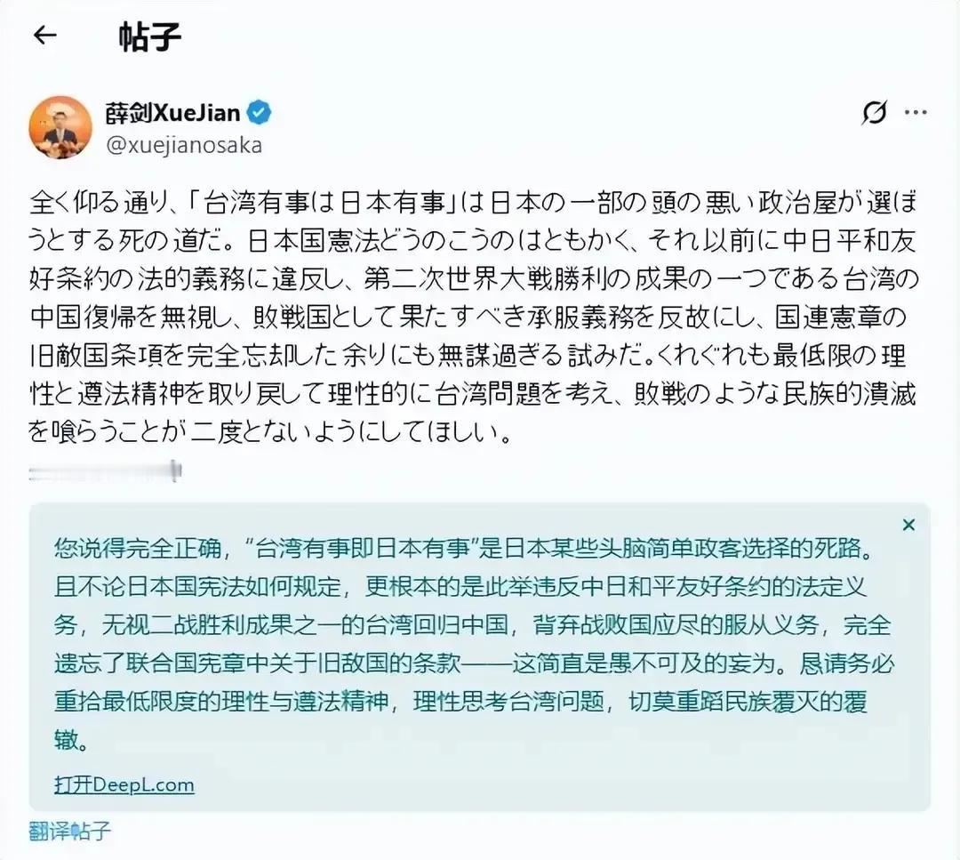中国驻日使馆今天(11月21日)写道:“《联合国宪章》专门设立敌国条款,德意日等