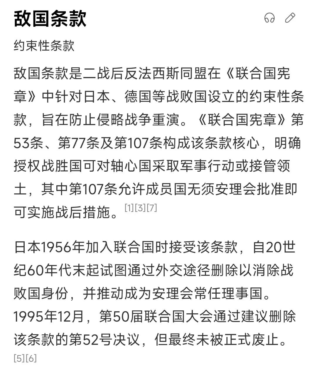 中国驻日使馆今天(11月21日)写道:“《联合国宪章》专门设立敌国条款,德意日等法西斯或军国主义国家的任何一国有再次实施侵略政策的任何步骤,中法苏英美等联合国创始成员国有权对其实施直接军事行动,无须安理会授权。” 日本1956年加入联合国时接受该条款,上世纪60年代末,日本四处游说要求废除该条款,1995年12月联合国大会通过建议删除,但由于日本政治精英们也包括高市早苗等成群结队参拜靖国神社、修改历史教科书等原因,不思悔改二战所犯下的罪行,因此没有提交联合国安理会投票表决,该条款至今未予废止。中国驻日大使馆再次发文提醒日本,勿忘记二战战败国身份,勿忘记日本军国主义对亚洲各国尤其是对中国所犯下的滔天罪行。