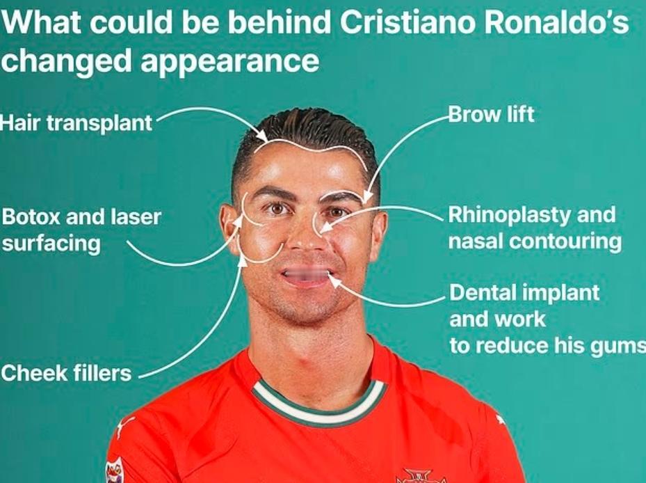 实锤了! 整形医生确定40岁的C罗进行过多次面部整形! 从鼻子,牙齿,面容等,多次缝缝补补,包括曾经一口拥挤的呲牙,还用了某种方式减少了牙龈漏出!变得更加整齐,亮白。。 爱美的C罗不仅如此,最显著的面部特征之一,就是他那光亮、平滑的前额。 40岁的人不会拥有如此光滑的皮肤!