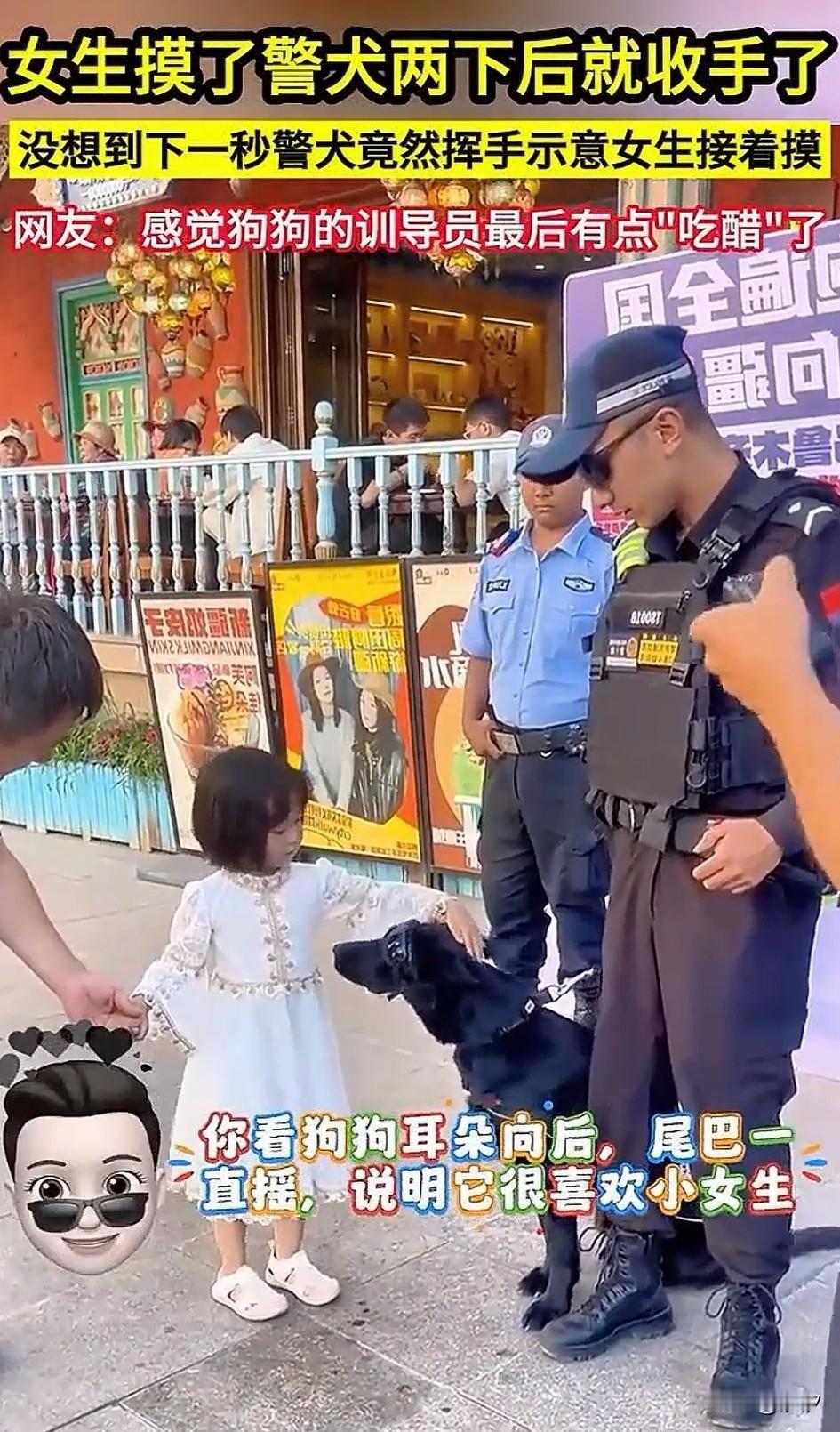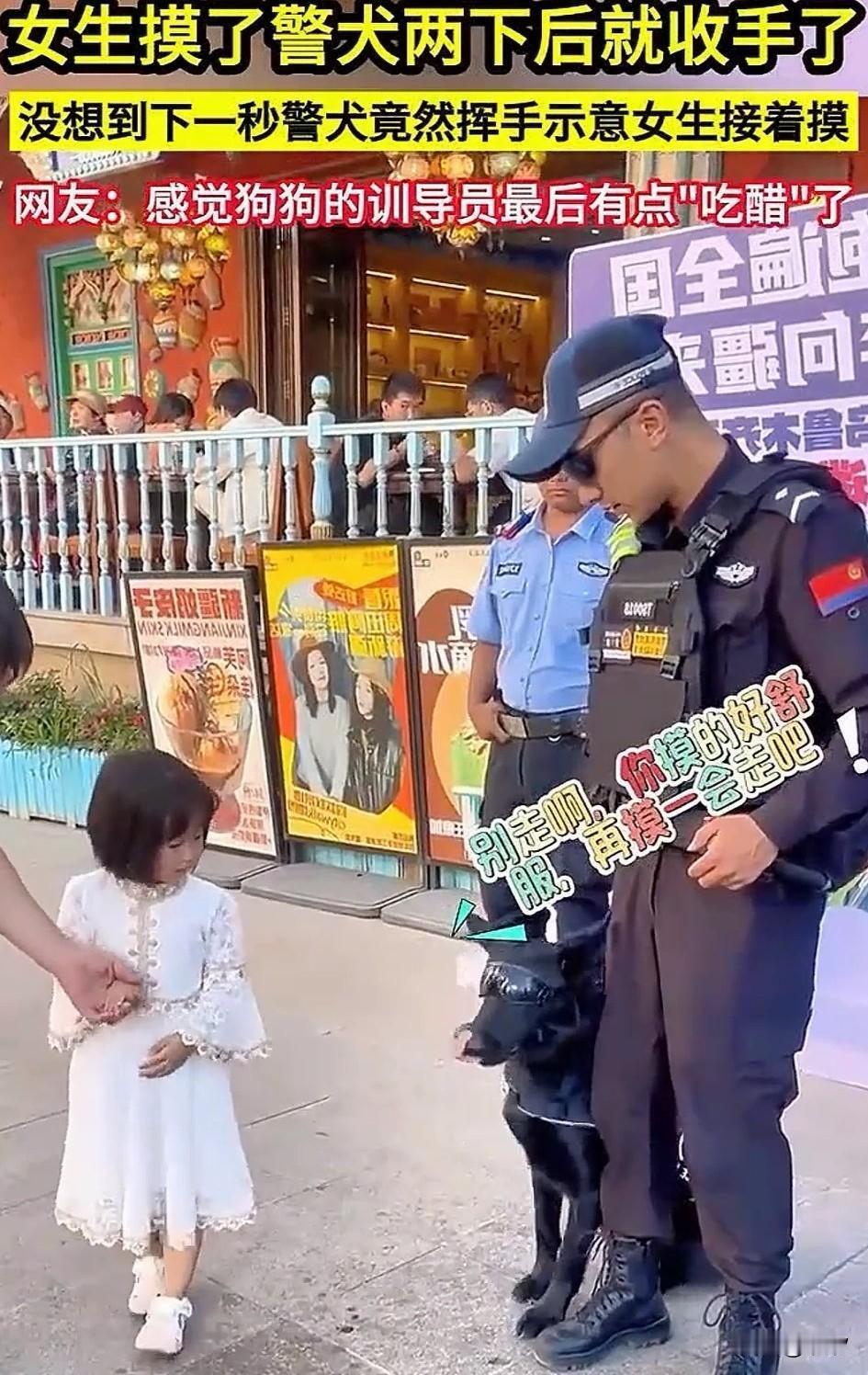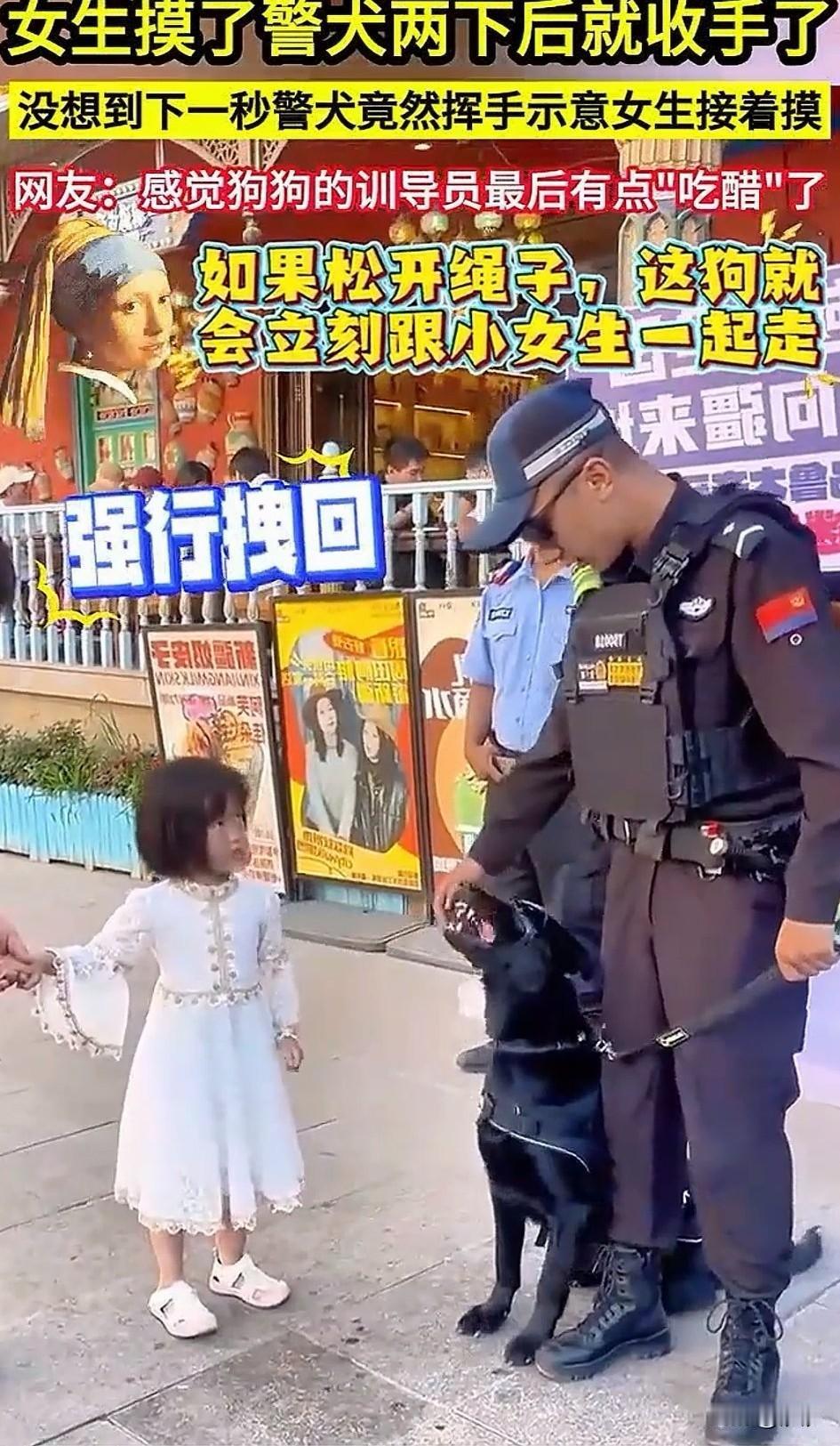 女孩和爸爸逛街, 路上看到了叔叔带着警犬执行任务, 由于非常喜欢警犬, 我忍不住伸手摸了摸警犬的头, 摸了两下女孩就收手了, 谁知警犬竟然挥手示让女孩继续摸, 看得出来警犬非常喜欢女孩, 它尾巴一直在不停的摇晃, 通常来说狗喜欢哪个人就会一直对它摇尾巴,女孩也不再犹豫, 伸手又摸了几下警犬, 警犬也开心坏了, 叔叔看到这样的情况, 也是把警犬往后拉了一下, 网友表示看来叔叔有点儿吃醋了, 看小女孩把他的警犬给拐走了, 你还别说现实中, 很多狗狗天生都喜欢女生, 这警犬也是非常的聪明, 大家对于这样的聪明的警犬喜欢吗? 警犬大队 警犬服从性训练 海关搜查犬 卡通警犬 禁毒警犬 狗狗营救小女孩